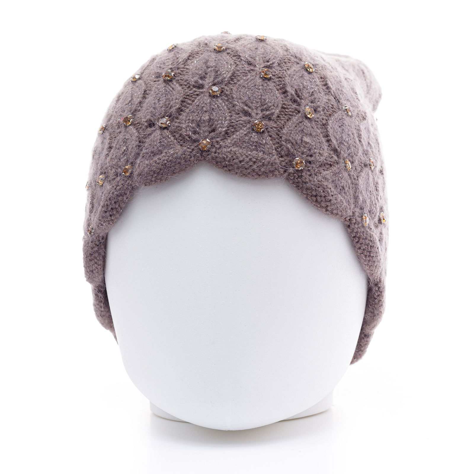 Caciula bej inchis model tricotat cu fir de lurex si strasuri aplicate, captusita in interior
