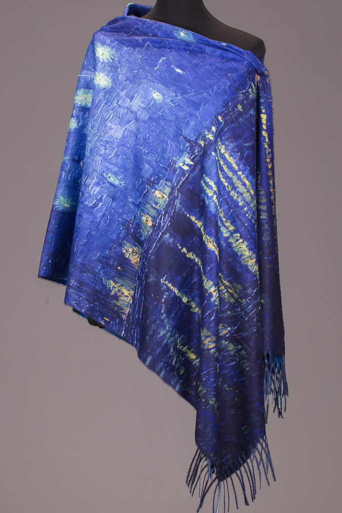 Esarfa cashmere cu doua fete imprimata cu reproduceri dupa " Noapte Instelata deasupra Rhonului" de Claude Monet