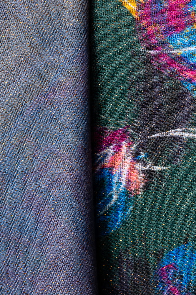 Esarfa are o fata imprimata si una uni si este confectionata dintr-un textil moale cu insertie de lurex, calduros si placut la atingere.