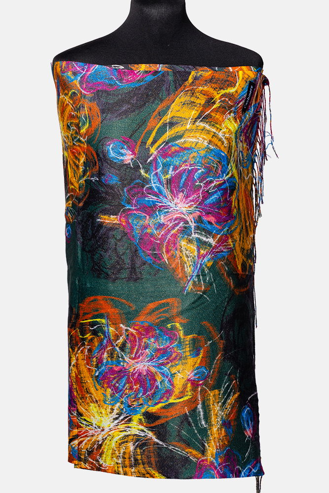 Shopika Esarfa cashmere cu fir din lurex, flori stilizate pe fond verde inchis