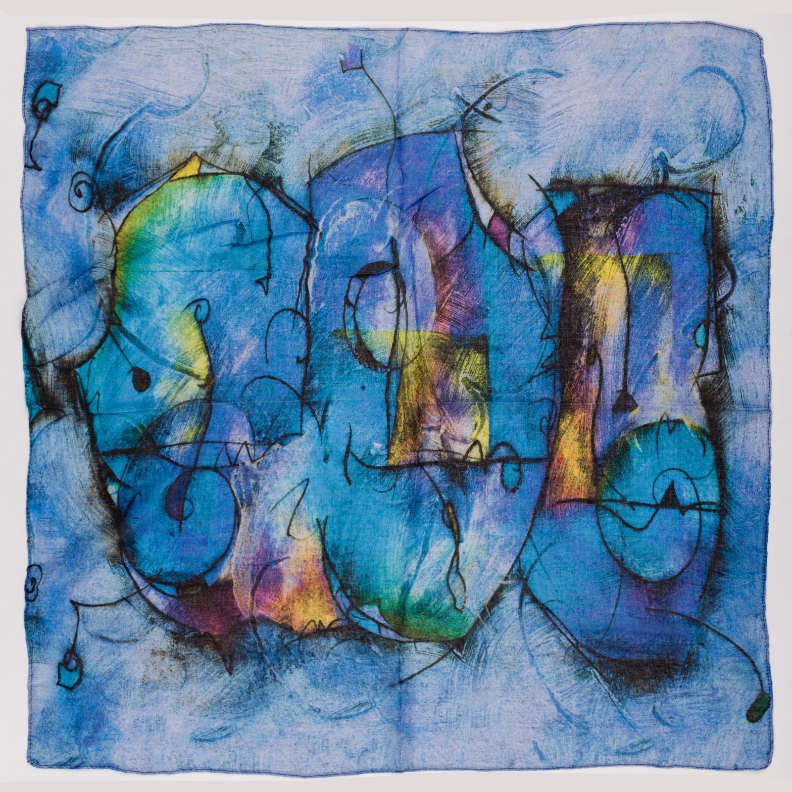 Shopika Esarfa cu doua fete tip batic din matase cu imprimeu grafic abstract pe fond bleu
