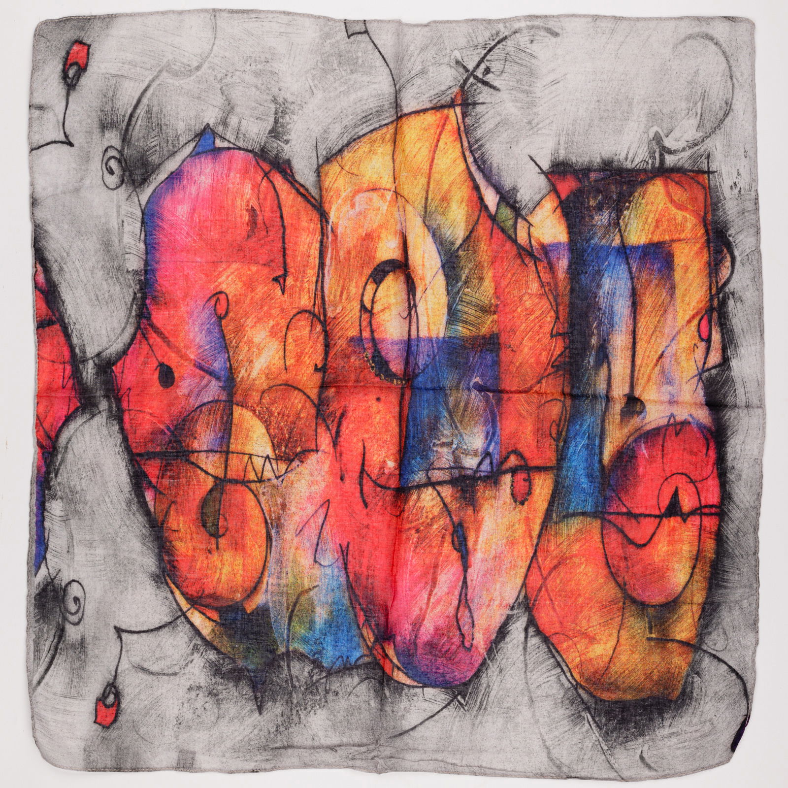 Shopika Esarfa cu doua fete tip batic din matase cu imprimeu grafic abstract pe fond gri deschis