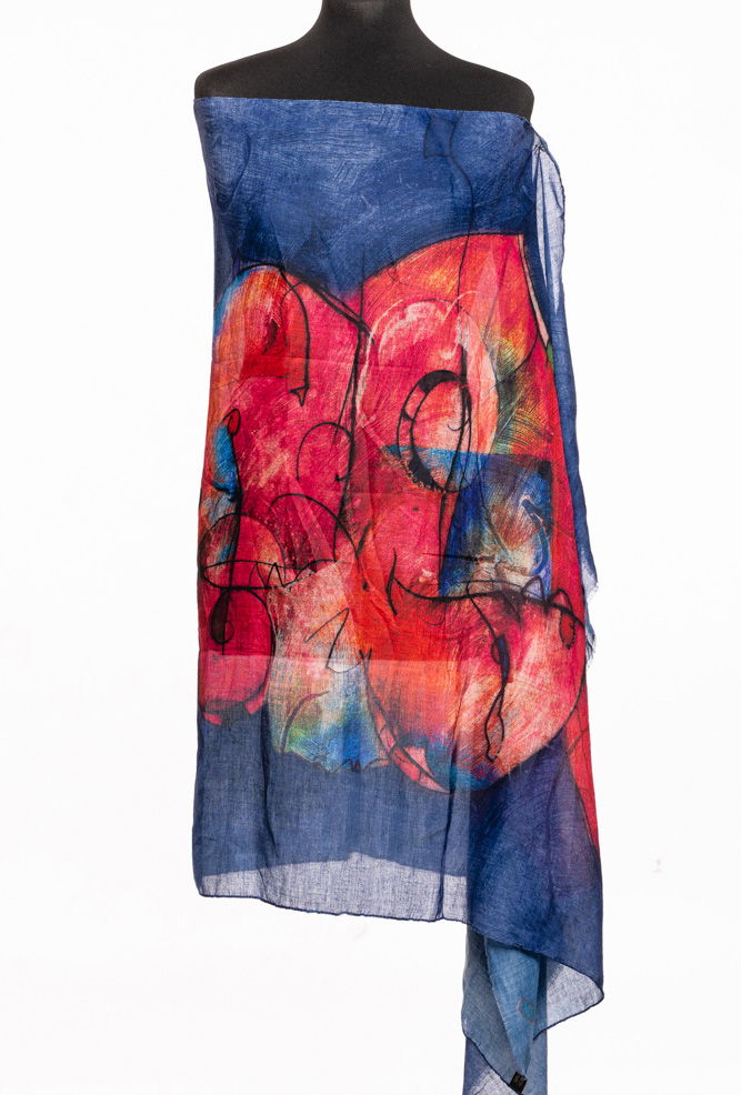 Shopika Esarfa din bumbac cu pictura abstracta in culori intense pe fond in nuante de albastru inchis