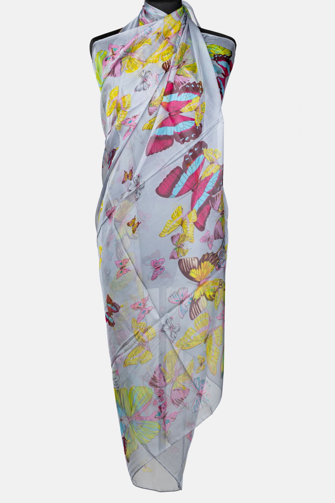 Shopika Esarfa dreptunghiulara tip pareo, cu fluturi pe fond gri deschis, din matase si vascoza