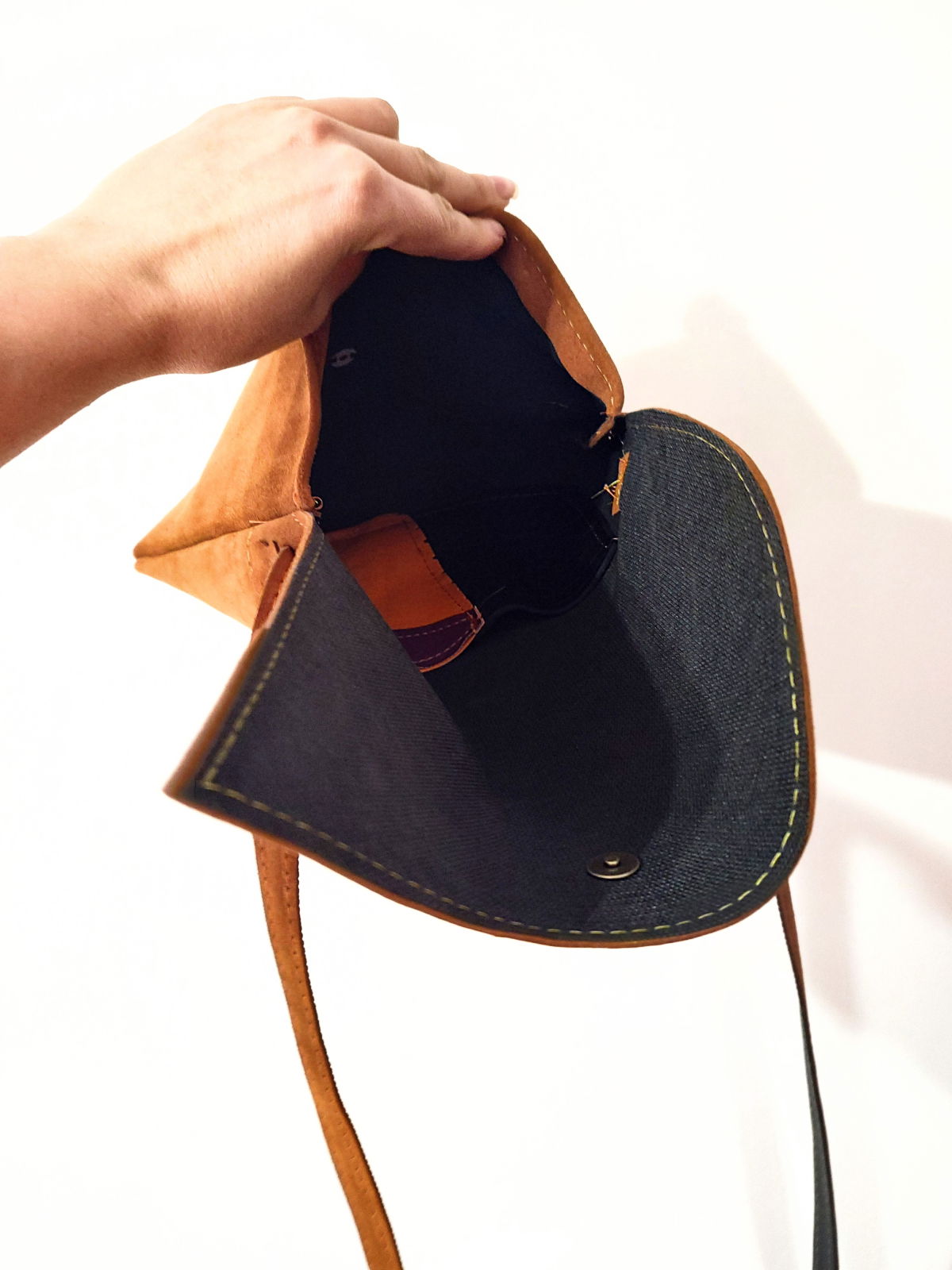 Se închide cu capsă magnetică ,este căptușită și prezintă un buzunar interior pentru telefon.