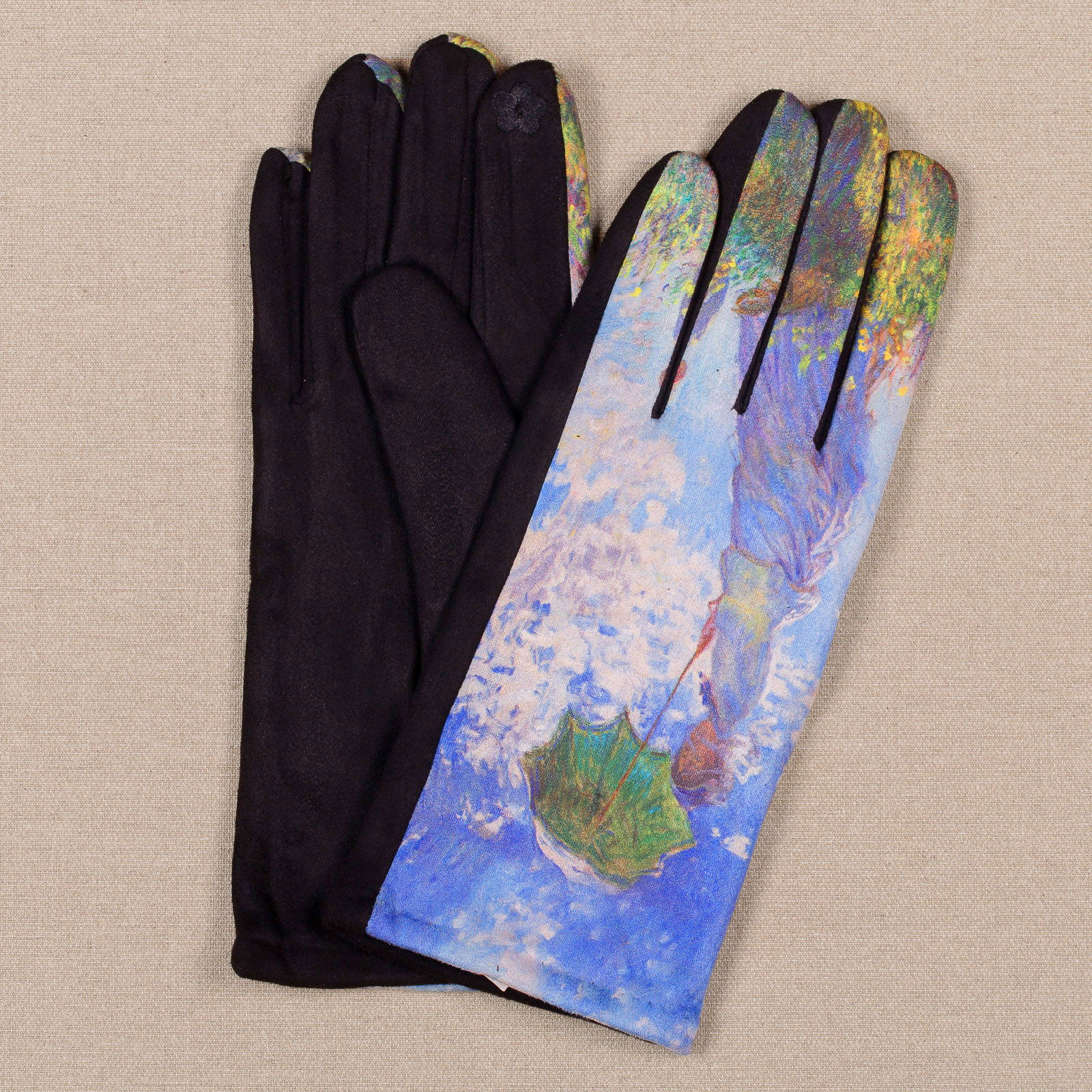 Perechea de manusi are fata imprimata cu o pictura inspirata din opera lui Claude Monet "Fata cu umbrela", iar palma este confectionata dintr-un textil negru, elastic, captusit la interior cu o blanita fina.