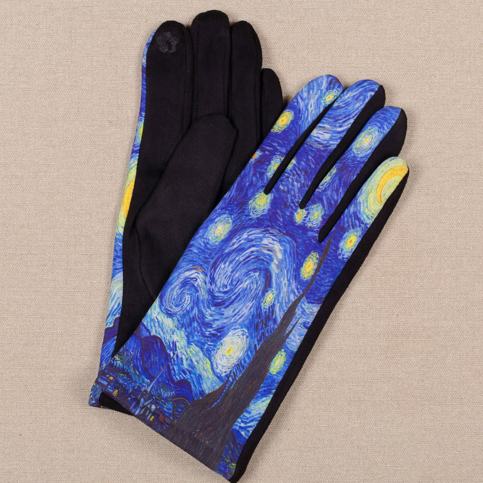 Perechea de manusi are fata imprimata cu o pictura inspirata din opera lui Vincent van Gogh "Noapte instelata", iar palma este confectionata dintr-un textil negru, elastic, captusit la interior cu o blanita fina.