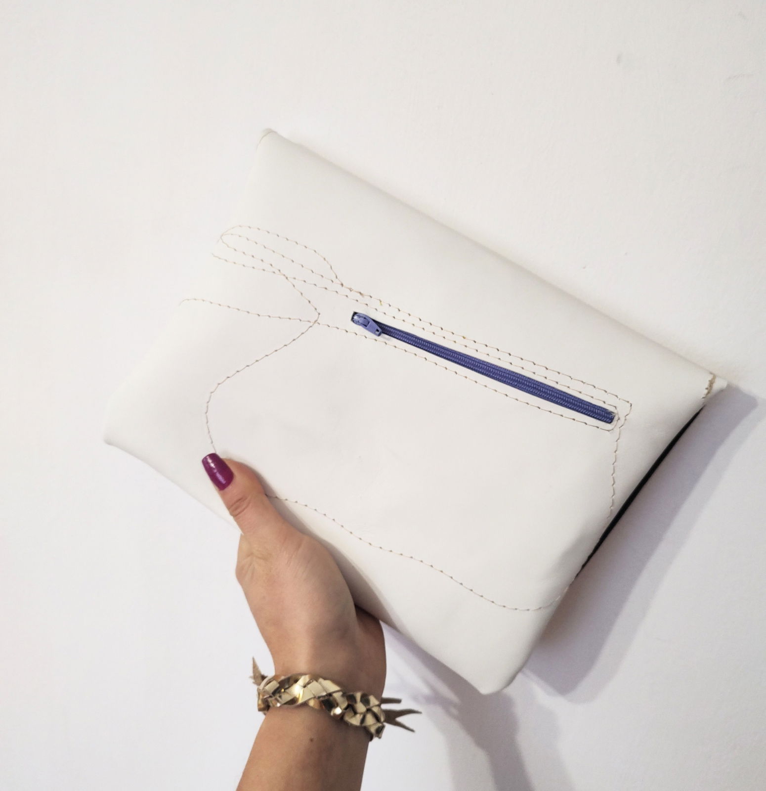 Se închide cu capsă magnetică ,este căptușit și prezintă un buzunar exterior , precum și două agățători din piele pentru eventualitatea atașării unui lănțișor .