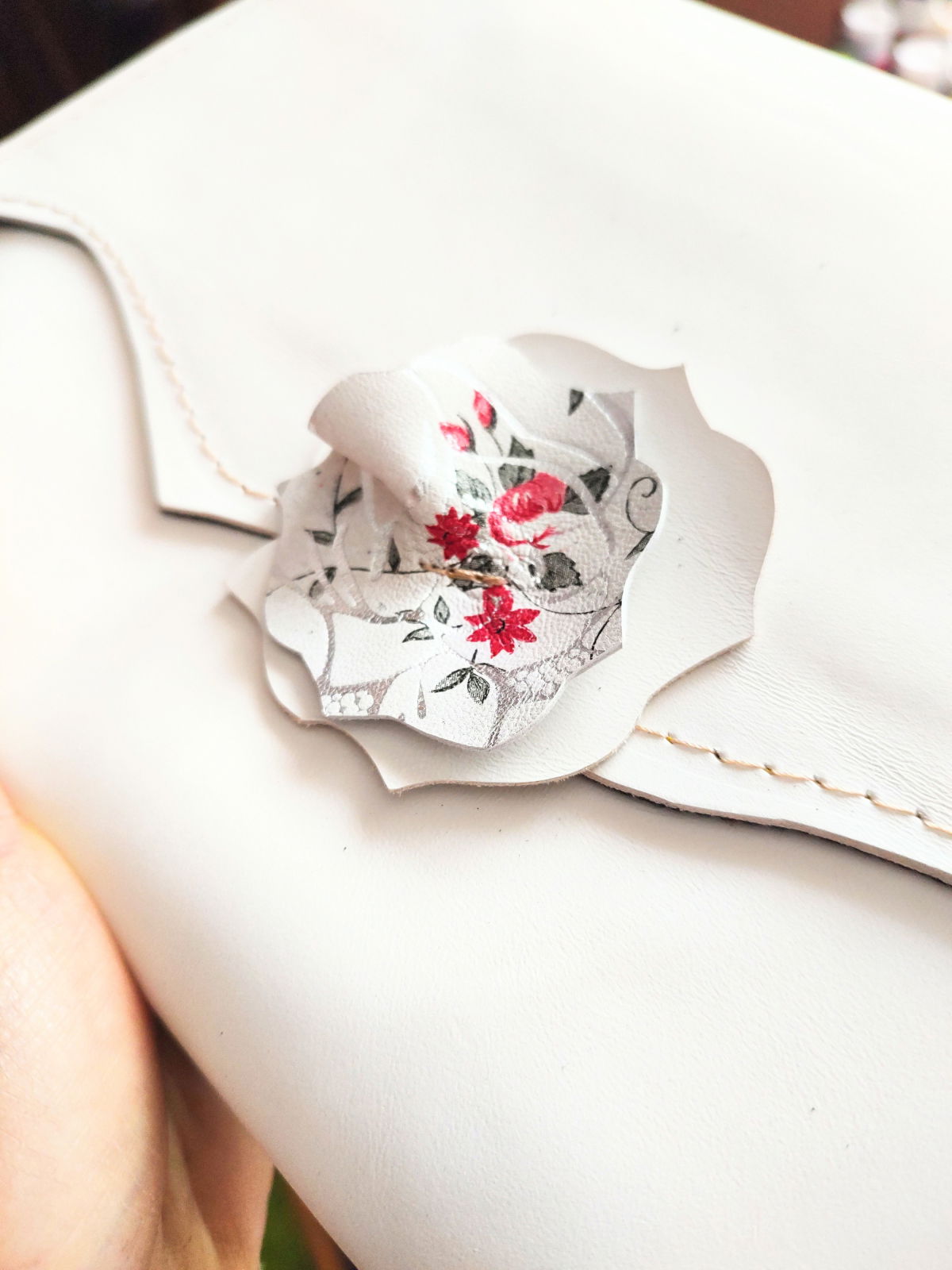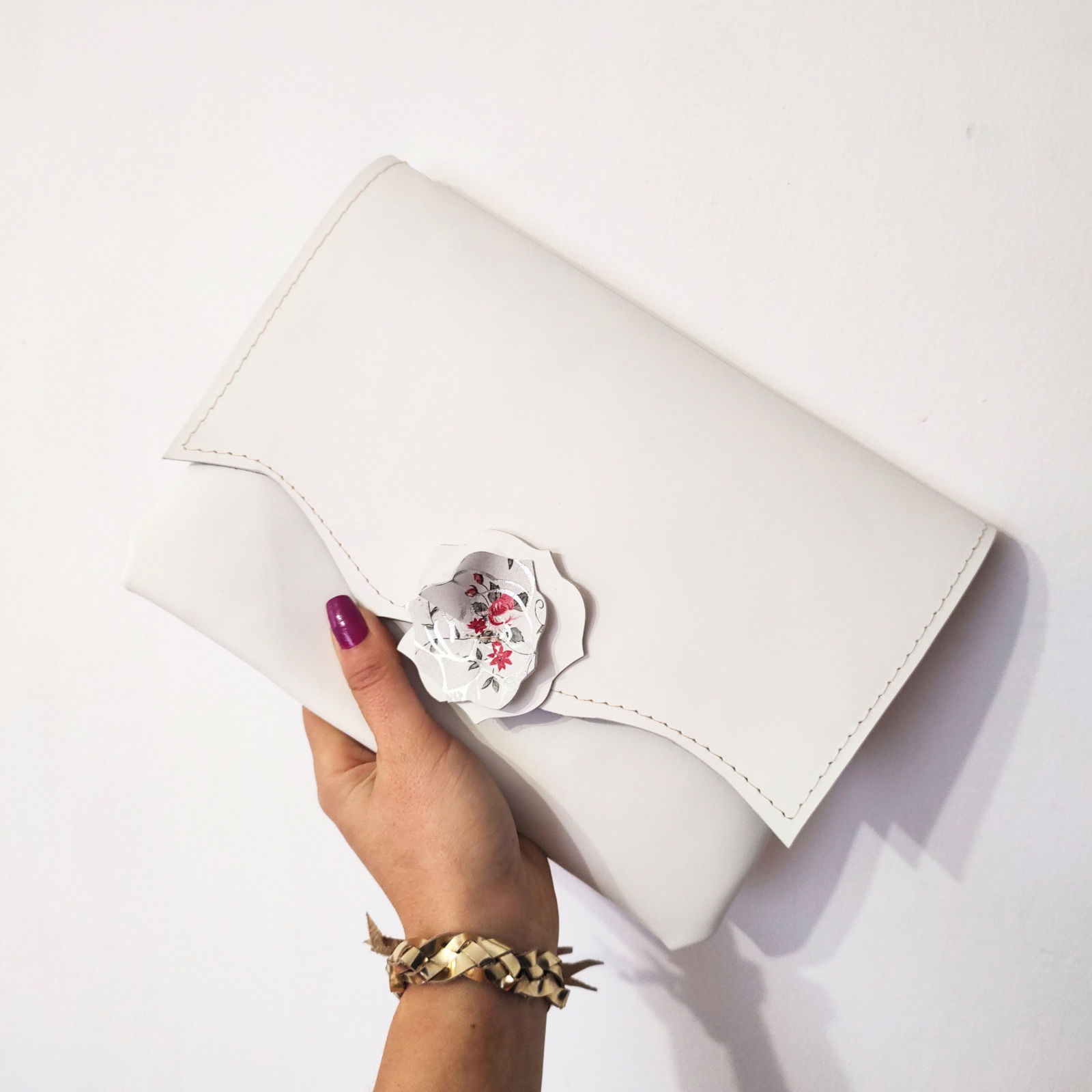 Trandafirul are un design tridimensional, fiecare petală fiind tăiată și modelată cu grijă pentru a crea un efect vizual romantic. Contrastul subtil dintre albul pur și imprimeul floral oferă un aer sofisticat și feminin, transformând acest plic într-o piesă statement.