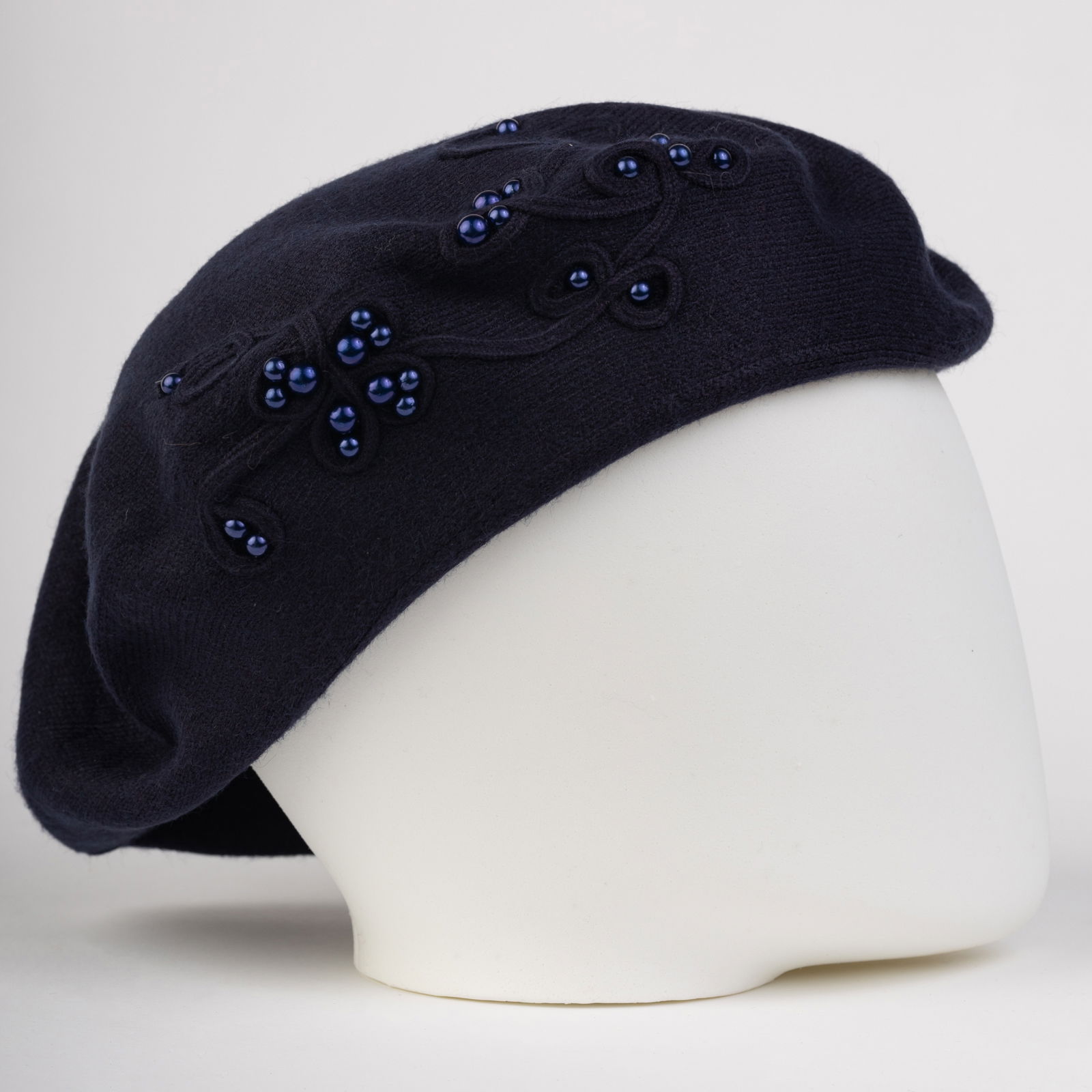 Shopika Bereta bleumarin chic, cu decoratiune tricotata si insertii de perle, din bumbac si lana