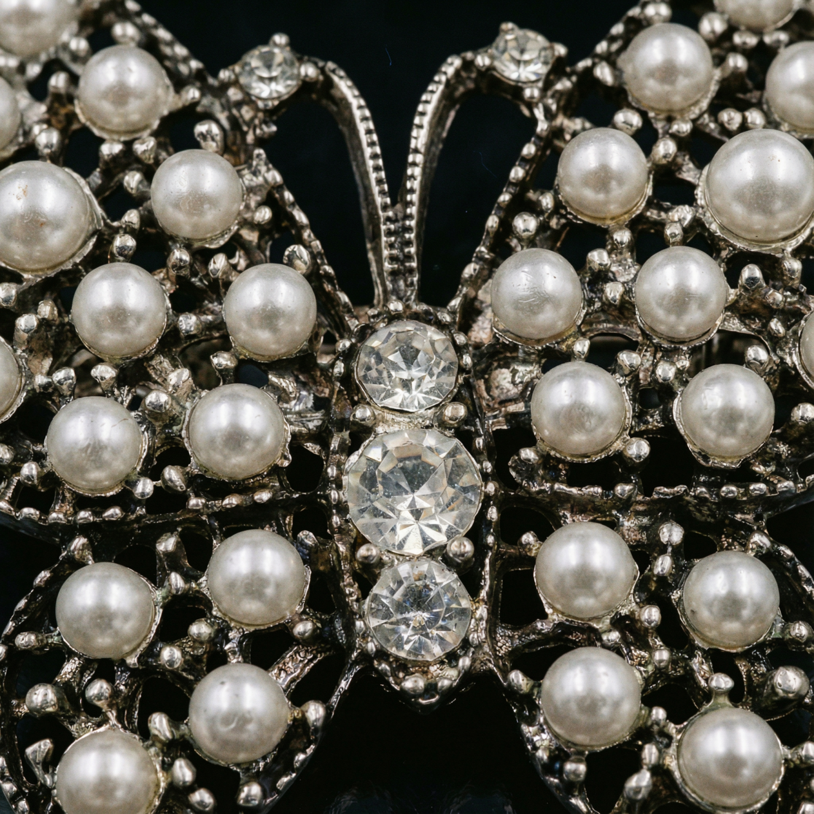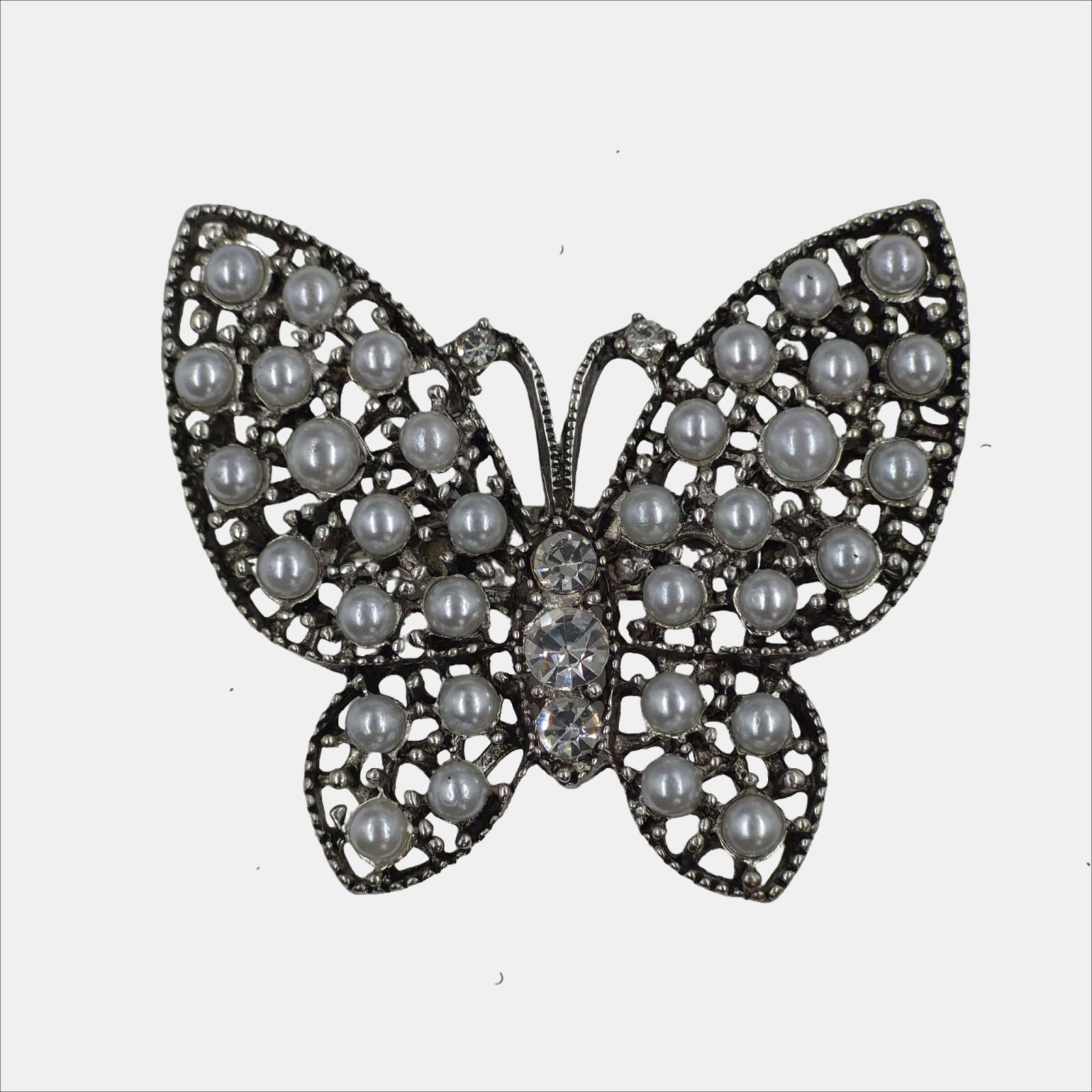 Aceasta brosa in forma de fluture impresioneaza prin designul sau delicat si detaliile atent lucrate. Realizata din metal cu finisaj vintage, piesa este decorata cu perlute artificiale si strasuri stralucitoare, creand un efect elegant si feminin.