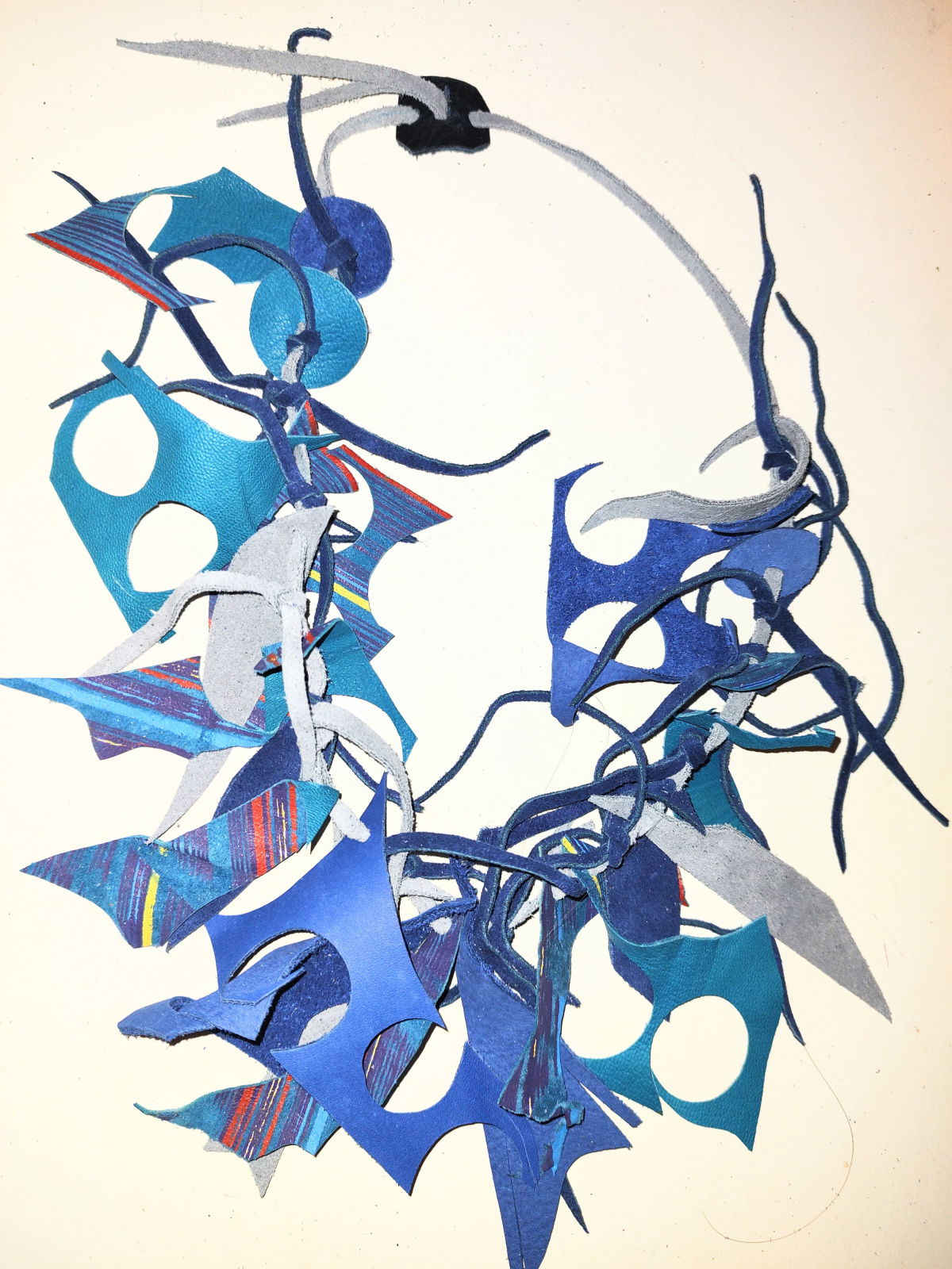 Un colier inedit realizat manual din mix de piele naturală,  ce reprezintă o  declarație de bună dispoziție și  stil. Formele fluide, franjurile suprapuse și combinația de culori creează un accesoriu artistic și nonconformist.