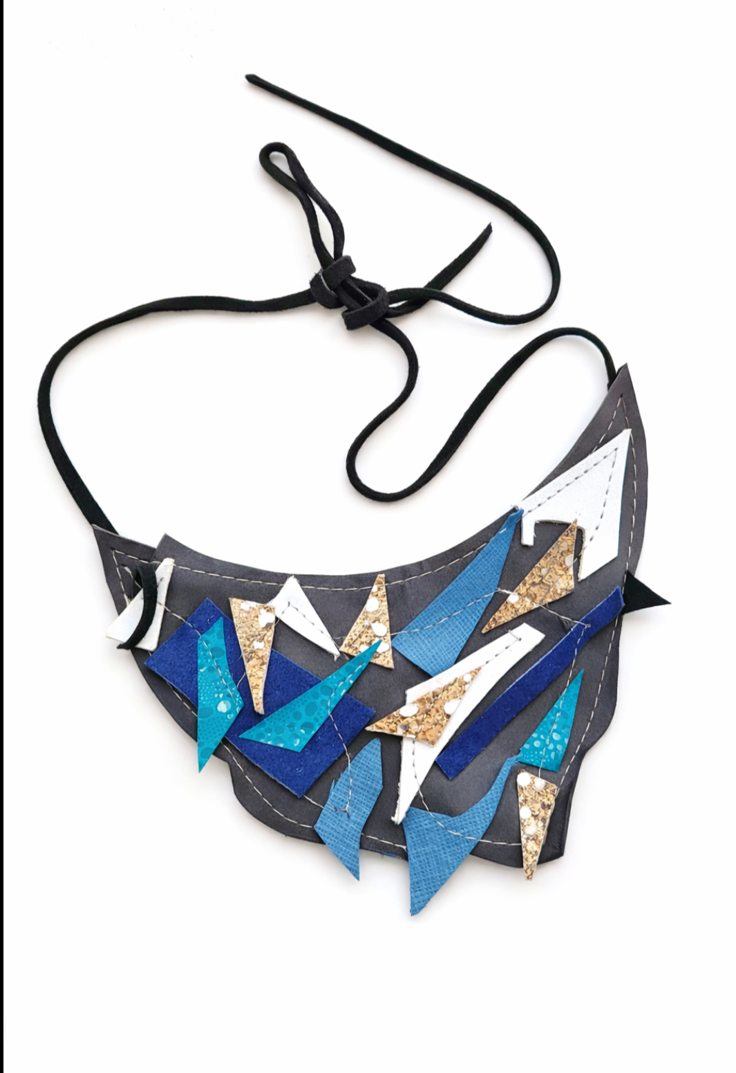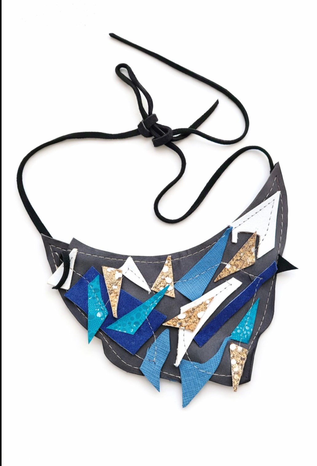 Acest colier asimetric, inspirat de energia sărbătorilor, îmbină armonios bleumarinul elegant cu albastrul electric , turcoazul și argintiul  .