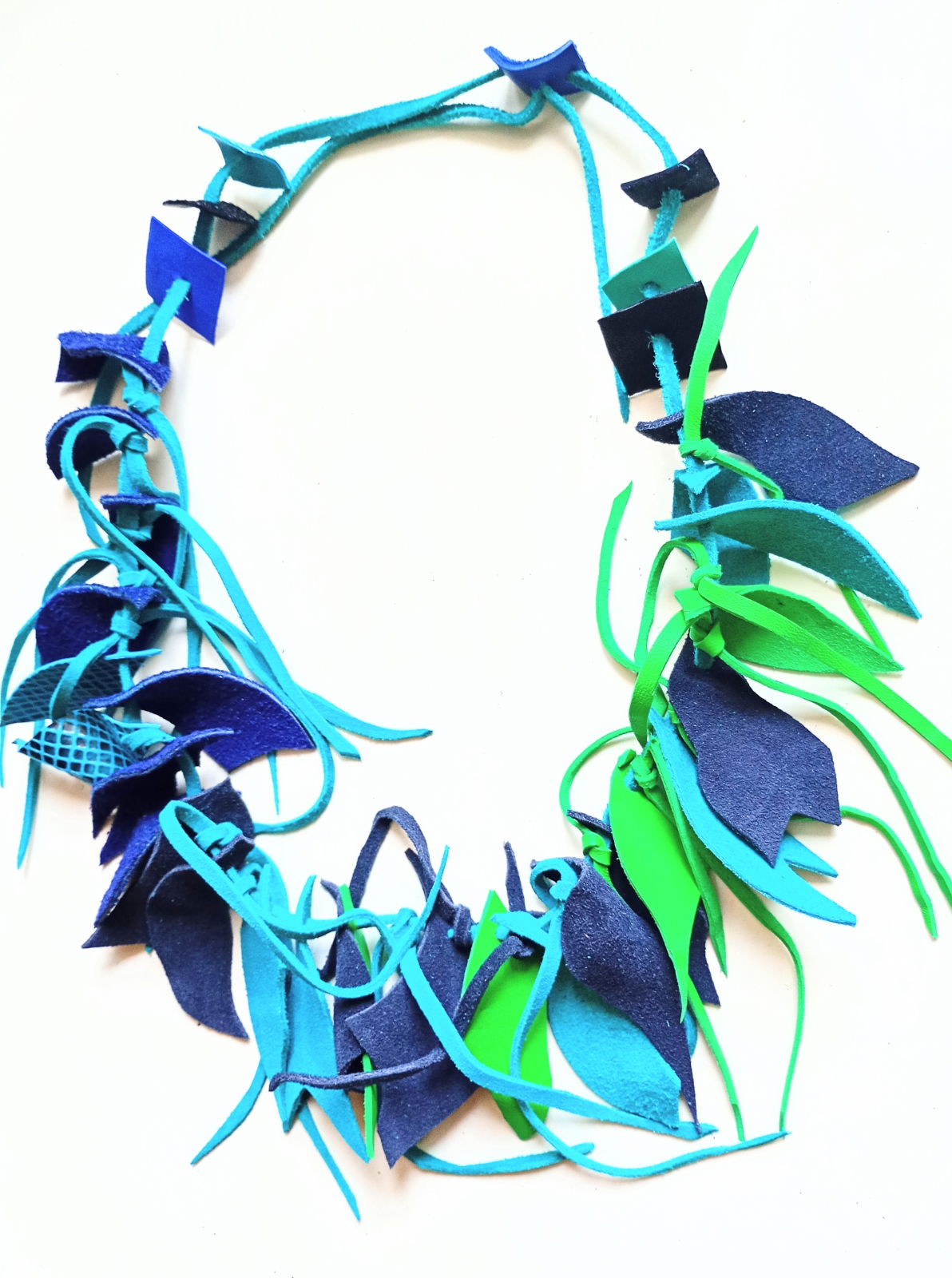 Un colier inedit realizat manual din mix de piele naturală,  ce reprezintă o  declarație de bună dispoziție și  stil. Formele fluide, franjurile suprapuse și combinația de culori creează un accesoriu artistic și nonconformist.