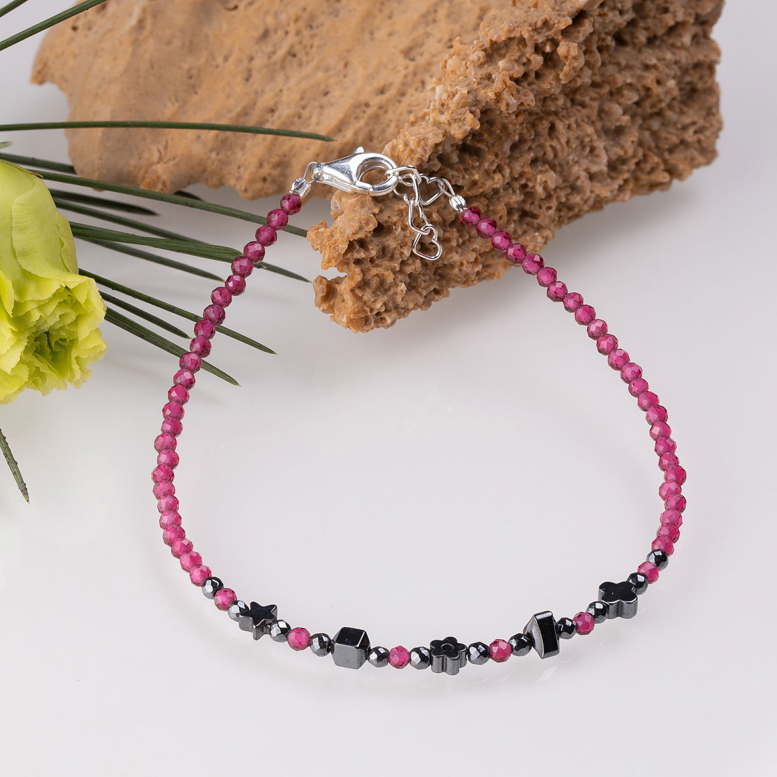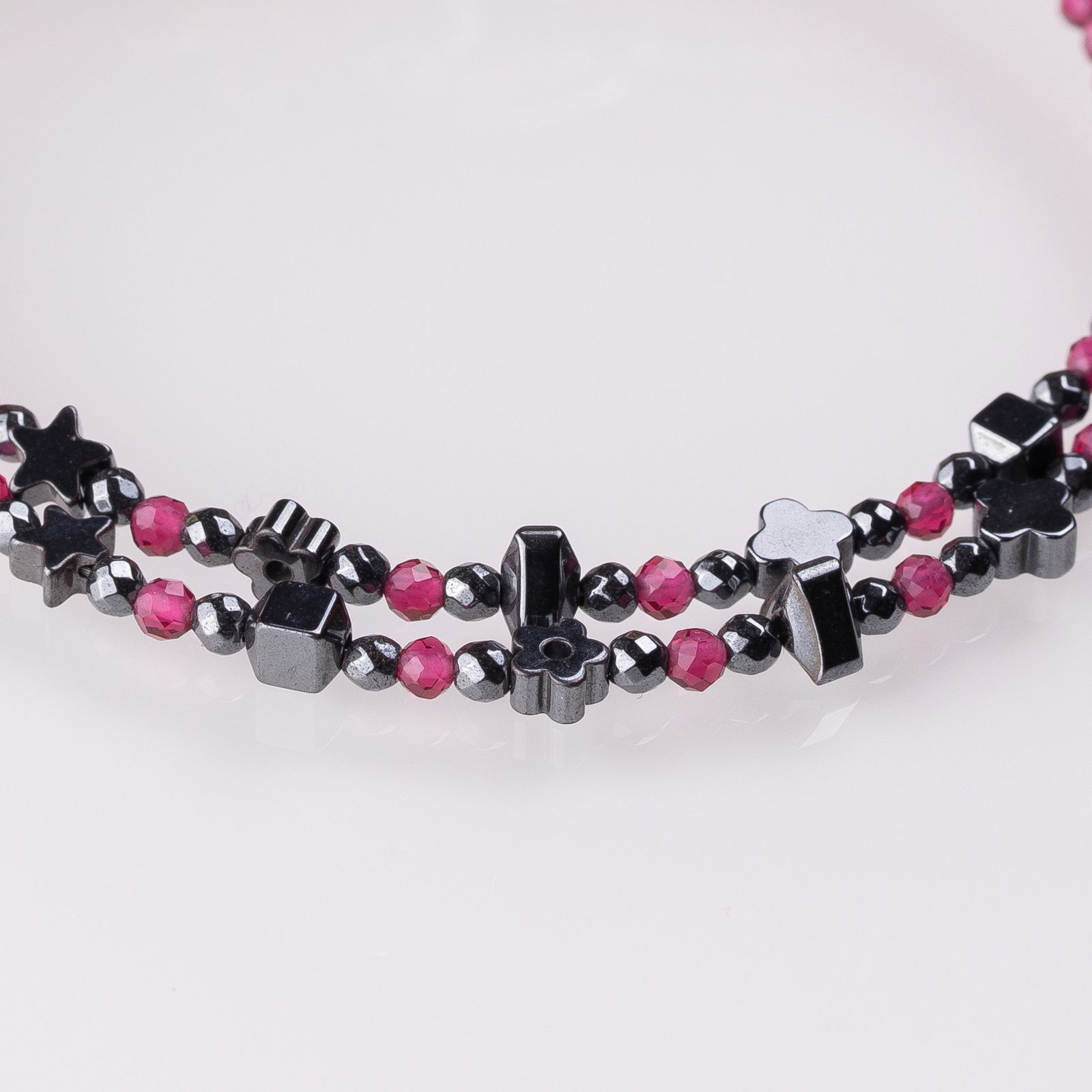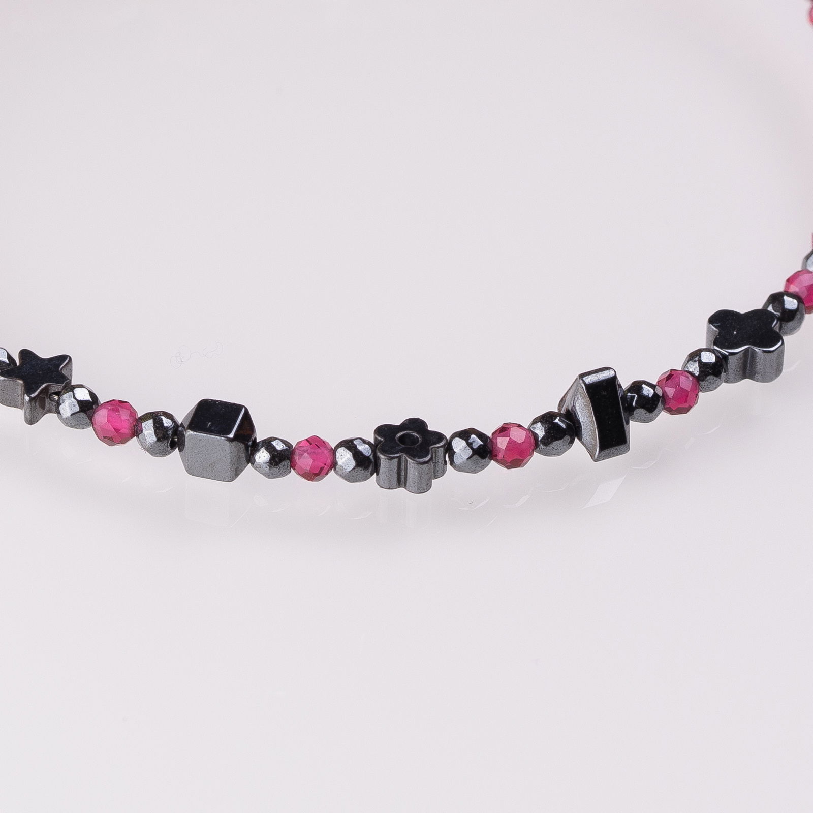 In partea din mijoc are pietre de hematit argintiu inchis de diferite forme.