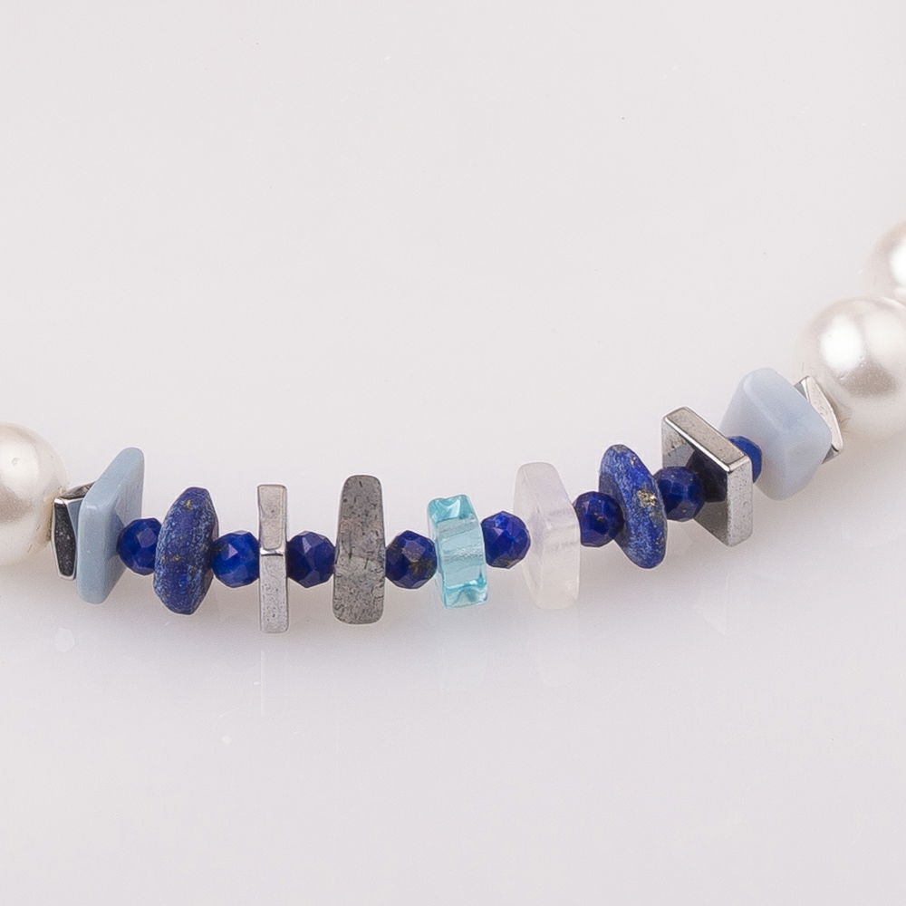In partea de mijloc are o combinatie de placute de apatit, lapis lazuli, calcedonie, labradorit si hematit. Incuietoare si lant prelungitor din argint.