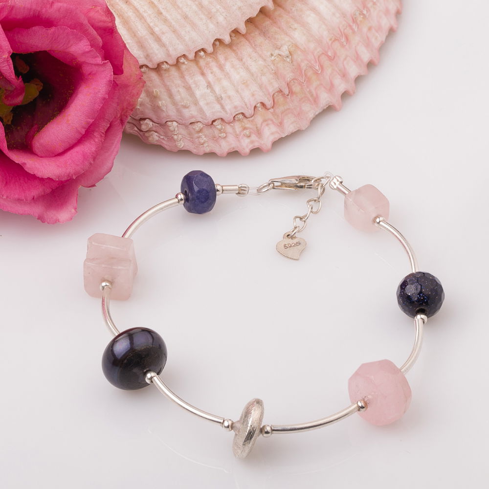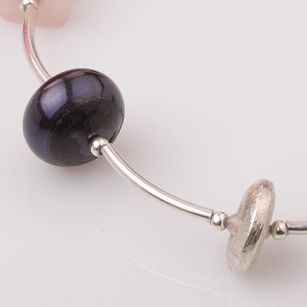 Bratara handmade cu tuburi curbe din argint, morganit fatetat (10 mm), cub si placute din cuart roz (8mm), cuart fatetat (8 mm), piatra lunii sintetica si perla naturala (10 mm).
