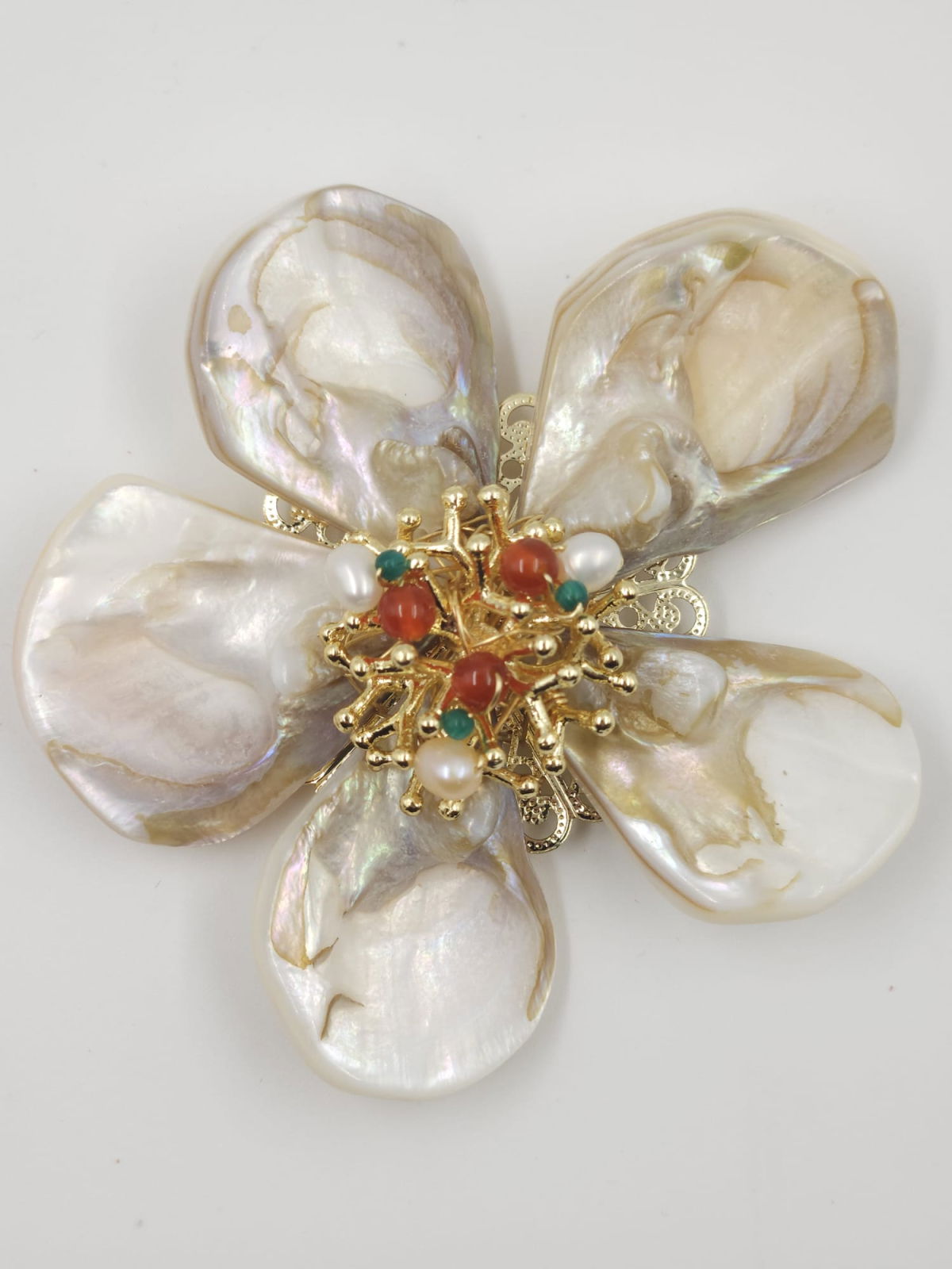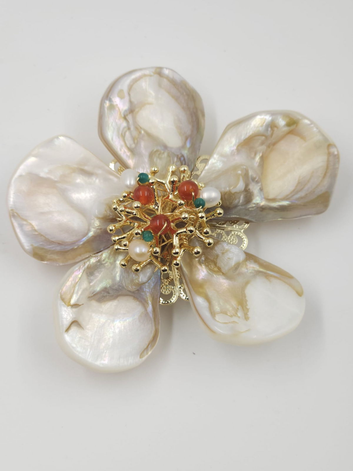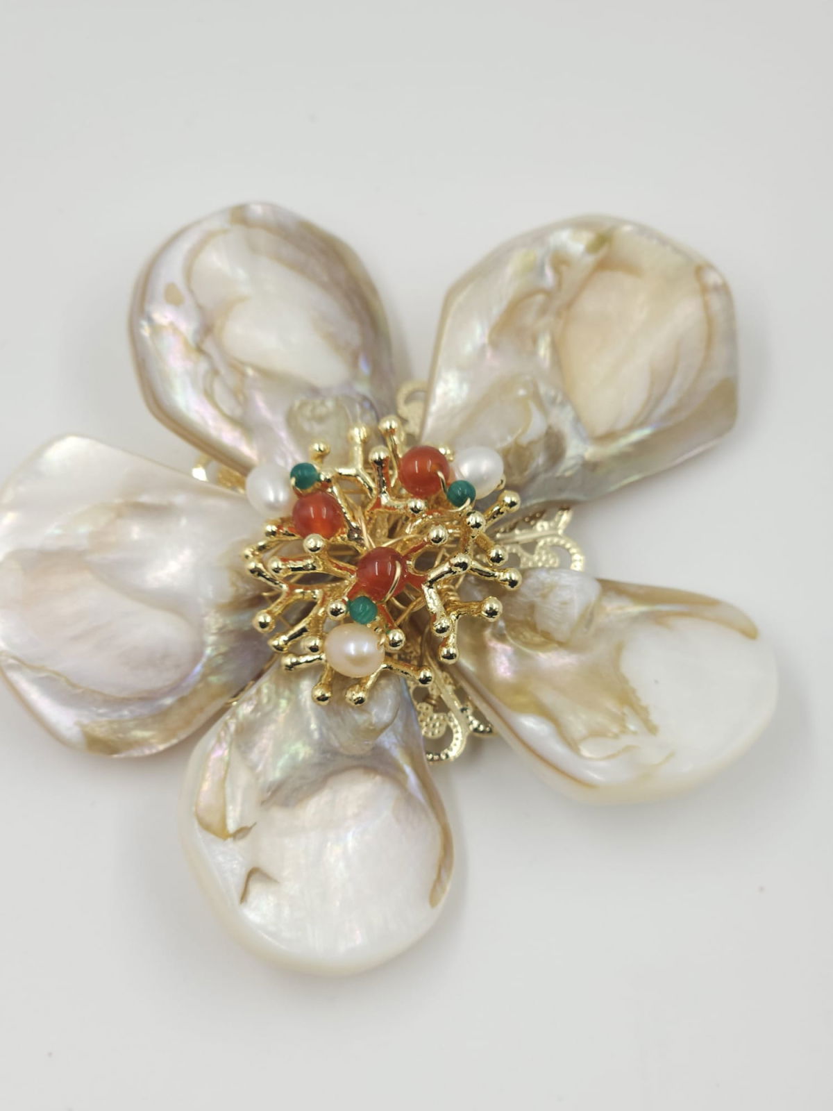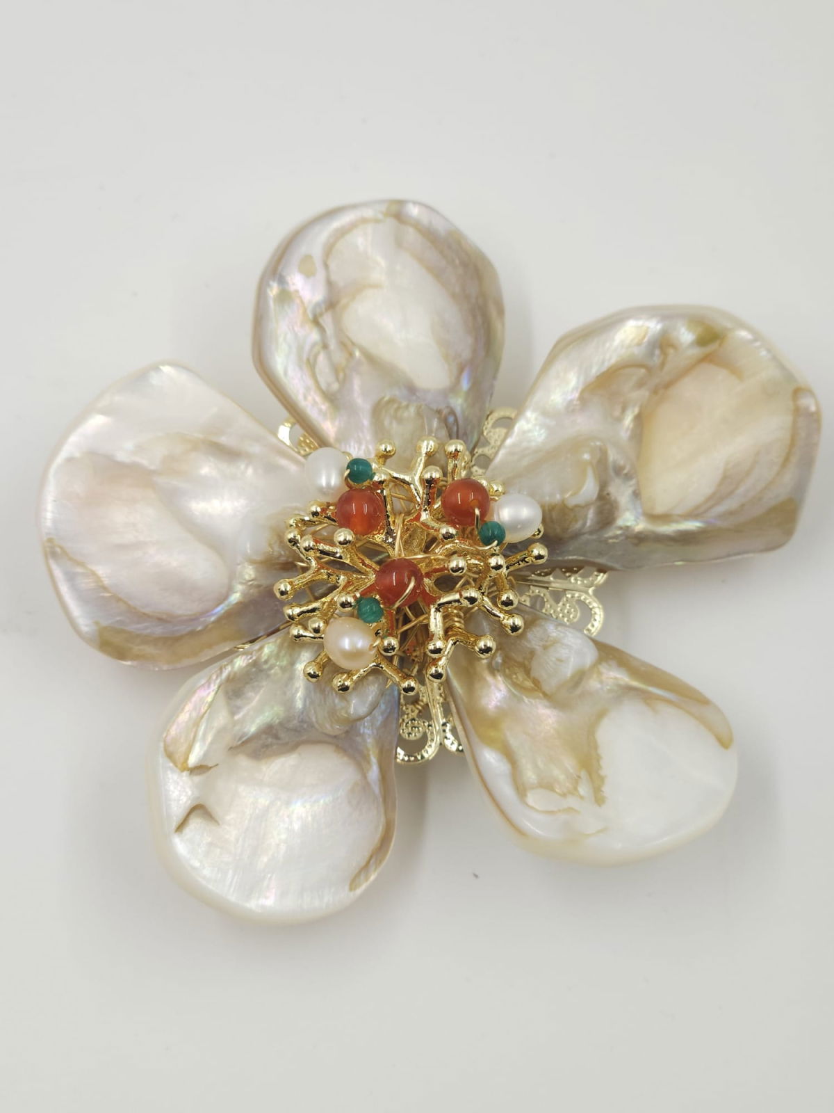 Shopika Brosa floare cu petale din scoica naturala si pietre naturale de carneol, executata manual