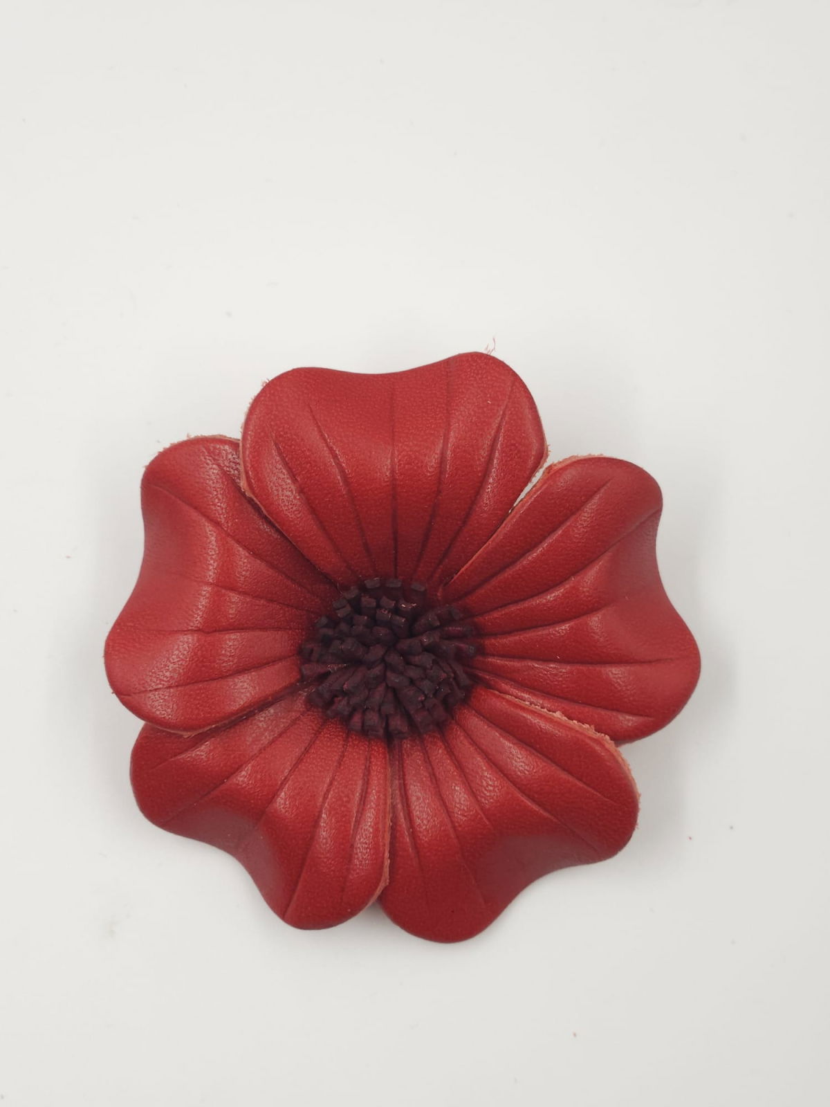 Shopika Brosa floare rosie cu petale rotunjite din piele naturala, executata manual