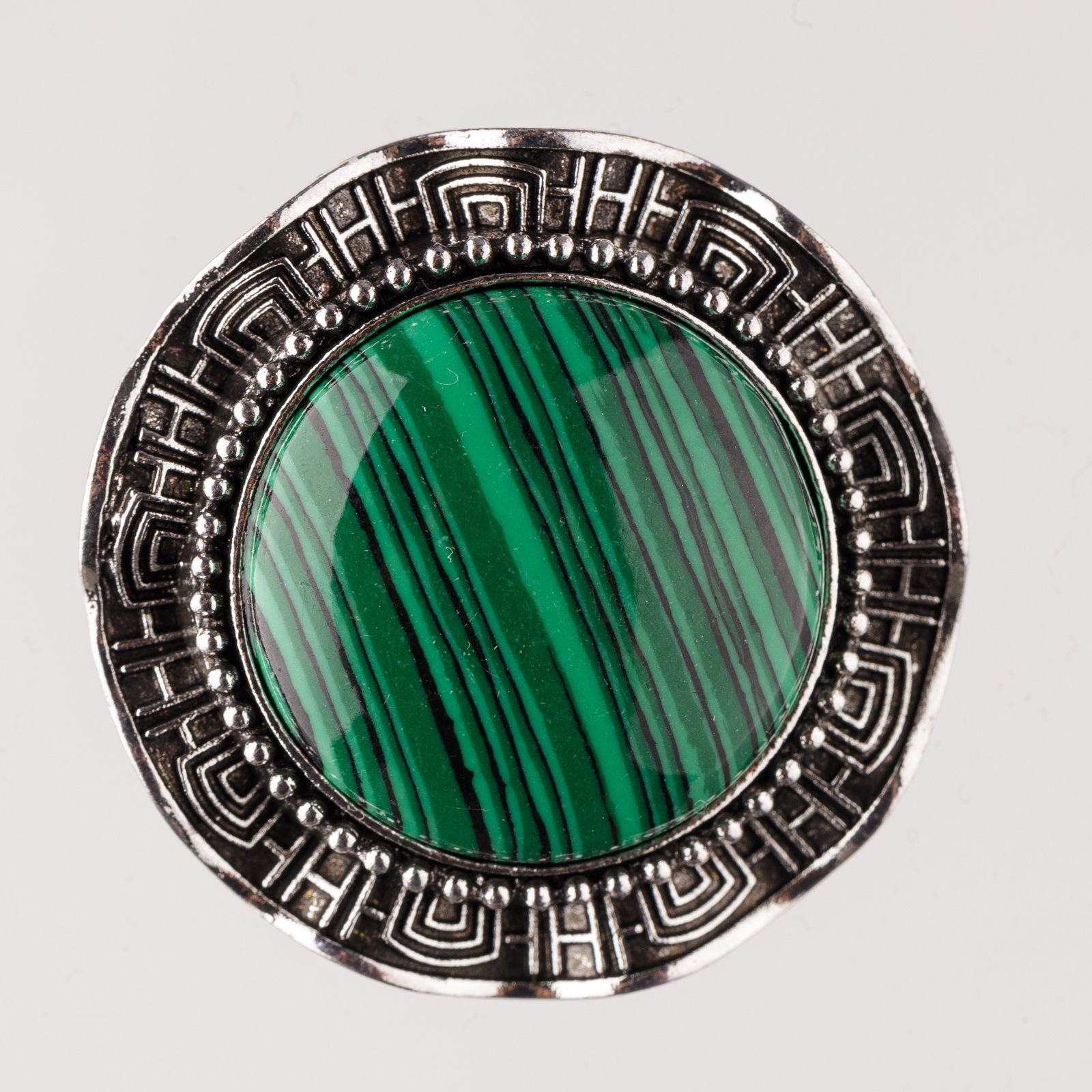 Shopika Brosa metalica argintie, rotund cu piatra naturala de malachit