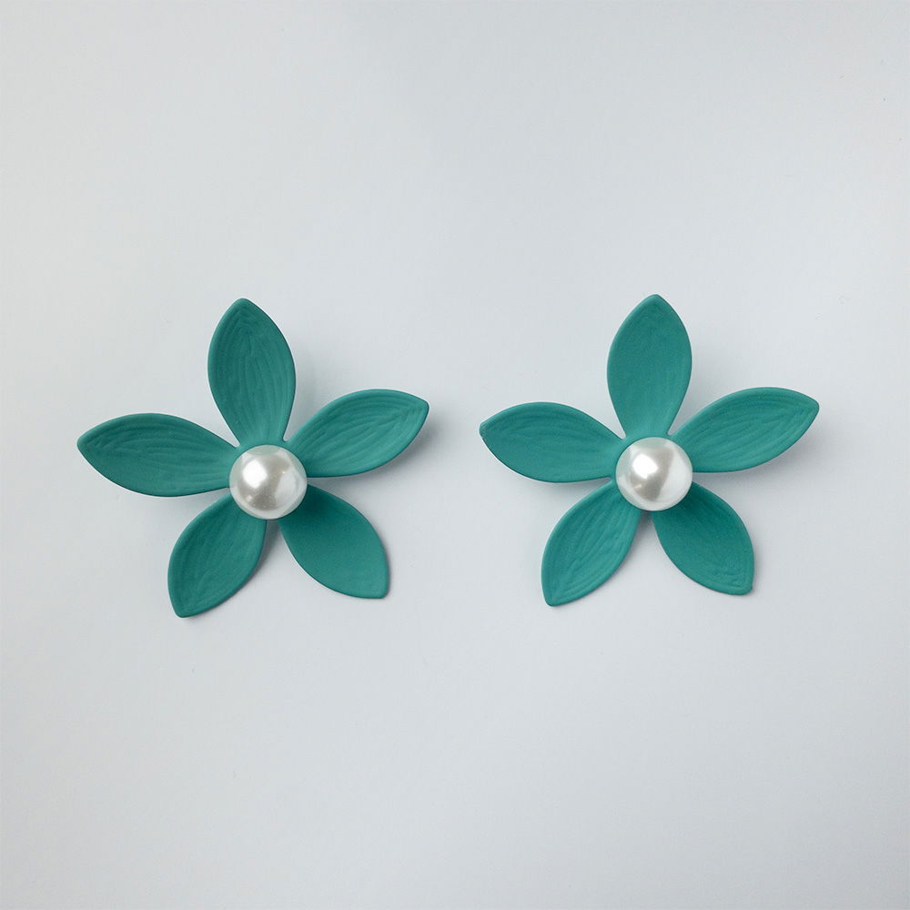 Shopika Cercei in forma de floare cu cinci petale si perla sintetica alba in mijloc, verde mat