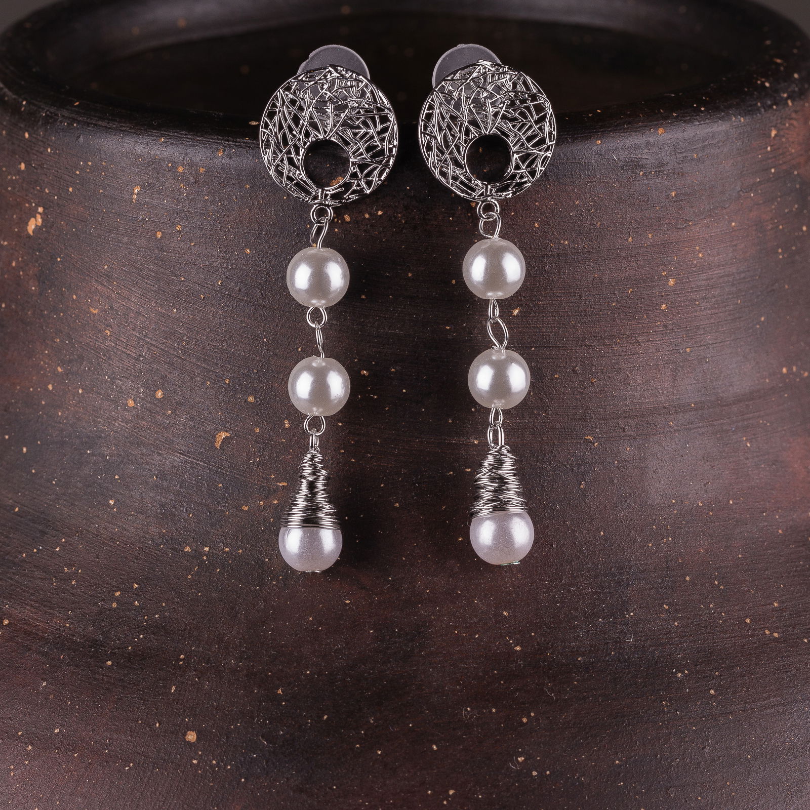 Cercei din metal argintiu, cu trei perle sintetice albe din care una infasurata in sarma metalica argintie. Cercei de lungime medie. Piesa (diametru 1,5 cm) din impletitura de sarma metalica subtire de forma rotunda pe lobul urechii.