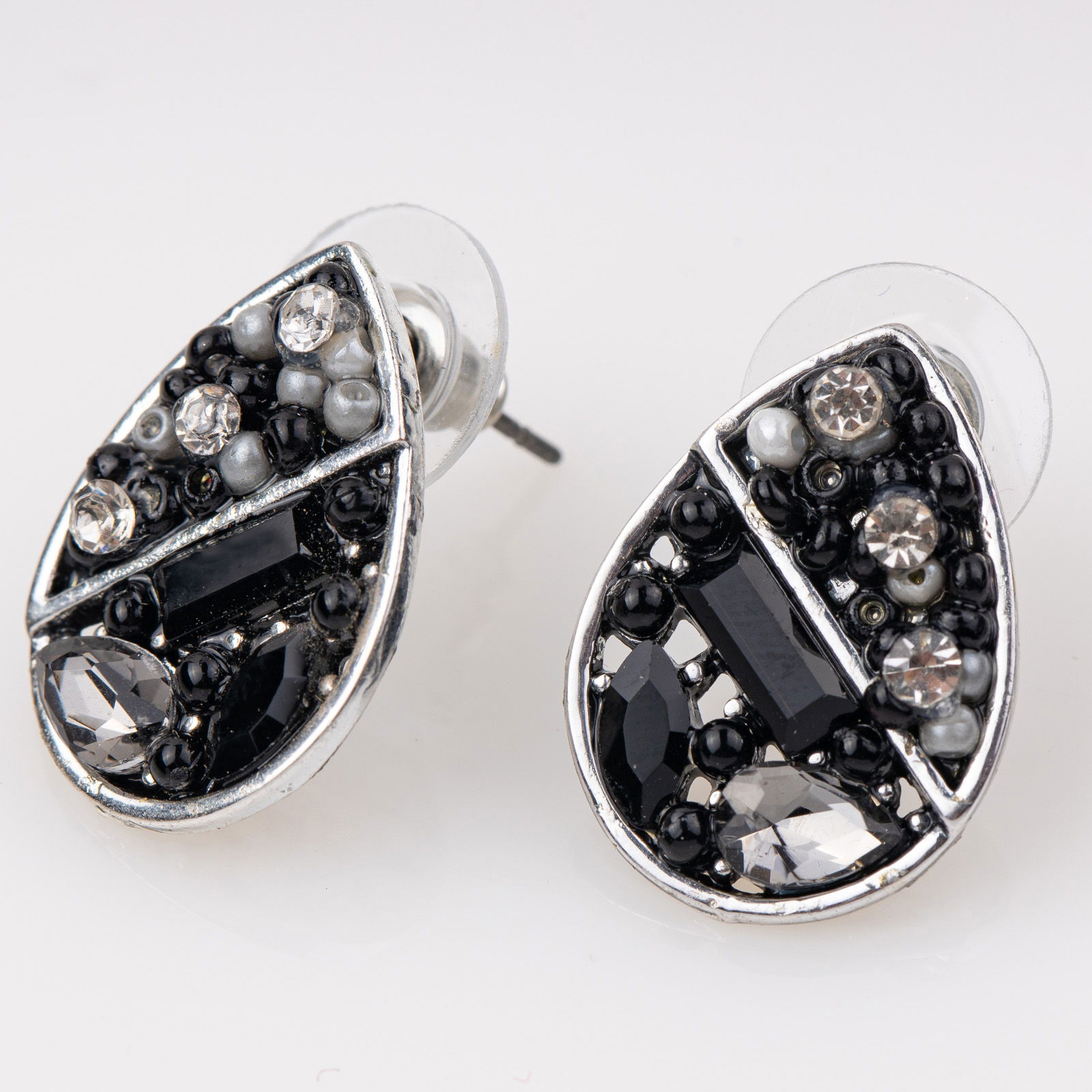 Cercei metalici argintii cu fata din pietre negre.