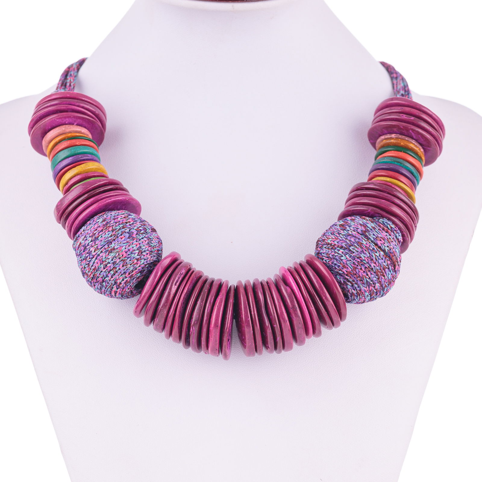 Shopika Colier cu elemente rontunde plate din lemn si textil, mov zmeura