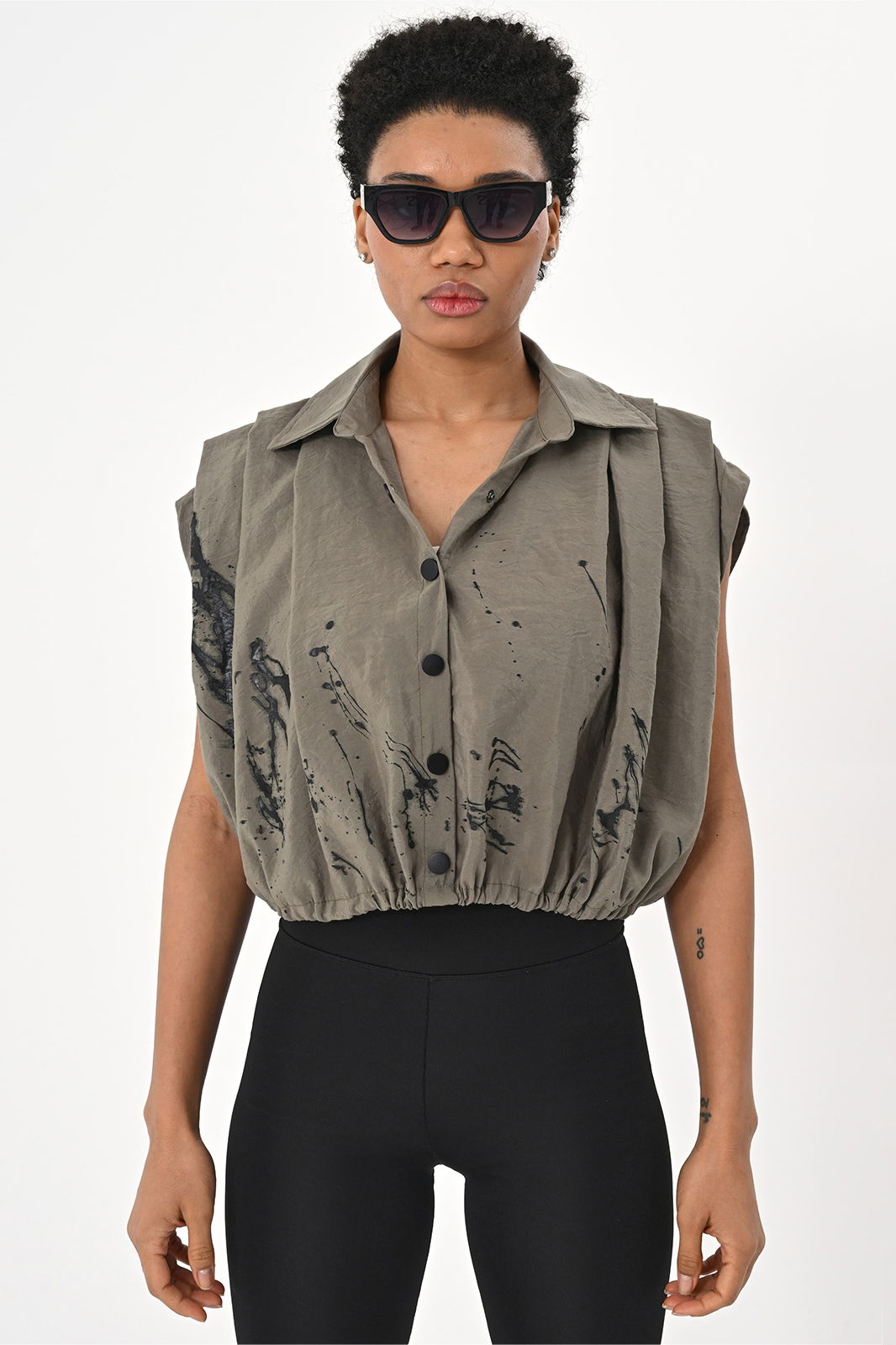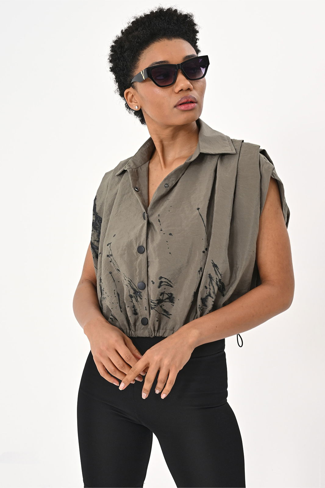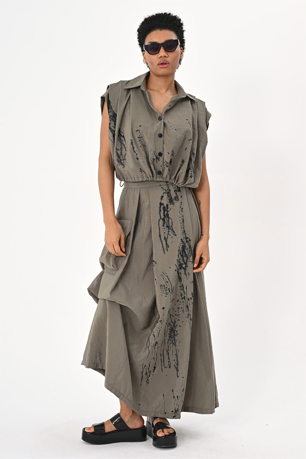 LES MIOS Compleu fusta asimetrica si bluza cu siret in talie, kaki cu dripping negru
