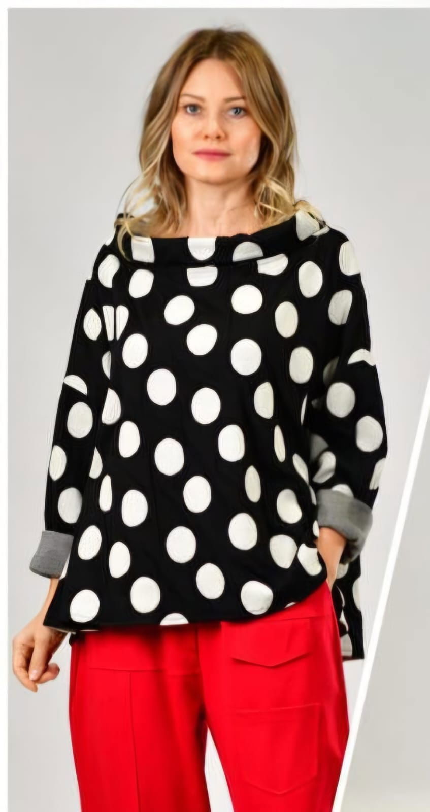 O bluza care iti transforma instant tinuta, combinand simplitatea grafica cu un efect 3D discret si elegant. Bulinele albe in relief ies frumos in evidenta pe fondul negru, oferind acea vibratie jucausa specifica pieselor statement premium.
