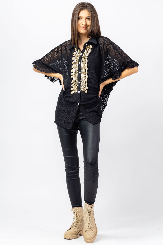 Shopika Bluza neagra eleganta din dantela cu aplicatie aurie