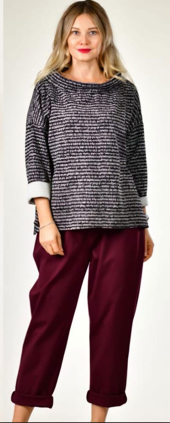 Manecile trei sferturi si gulerul rotund contureaza un look relaxat, foarte actual, iar contrastul negru-gri ofera o versatilitate remarcabila. Este bluza perfecta pentru zile dinamice, pentru birou sau pentru iesiri urbane, usor de asociat cu pantaloni drepti, culottes sau denim.