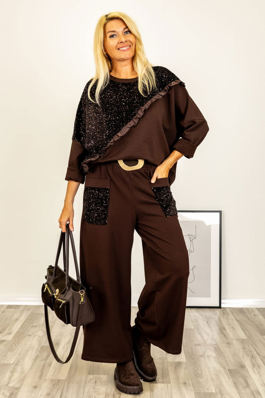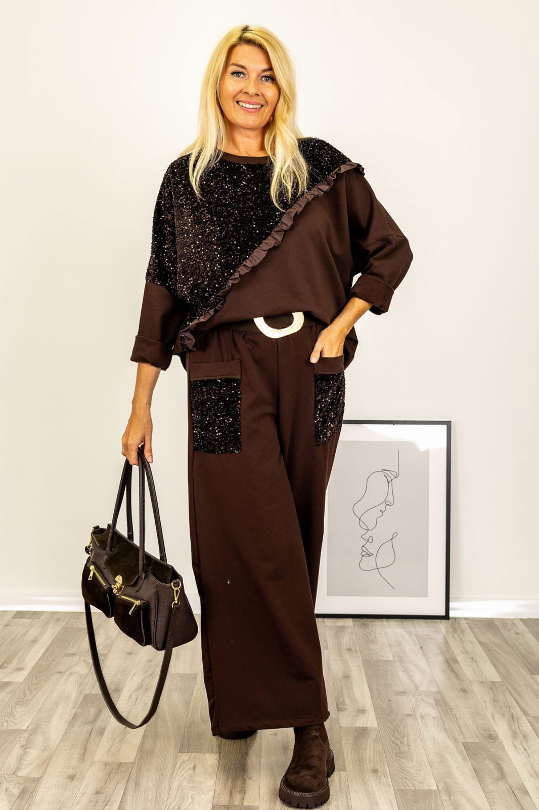 Shopika Bluza oversize din tricot cu paiete si volanas din tafta, maro