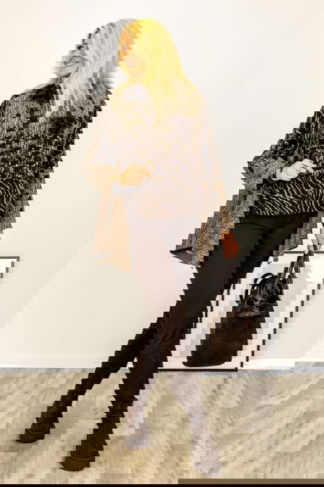 O bluza spectaculoasa, gandita pentru femeia care iubeste piesele confortabile dar cu impact vizual puternic. Textura moale si croiul lejer ofera libertate de miscare, iar jocul de imprimeuri artistice in nuante de maro si bej creeaza un efect grafic sofisticat, perfect pentru tinute moderne si effortless.