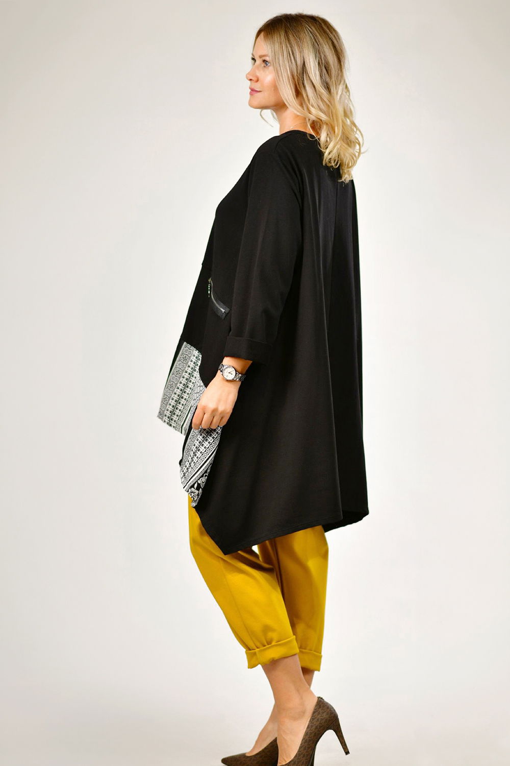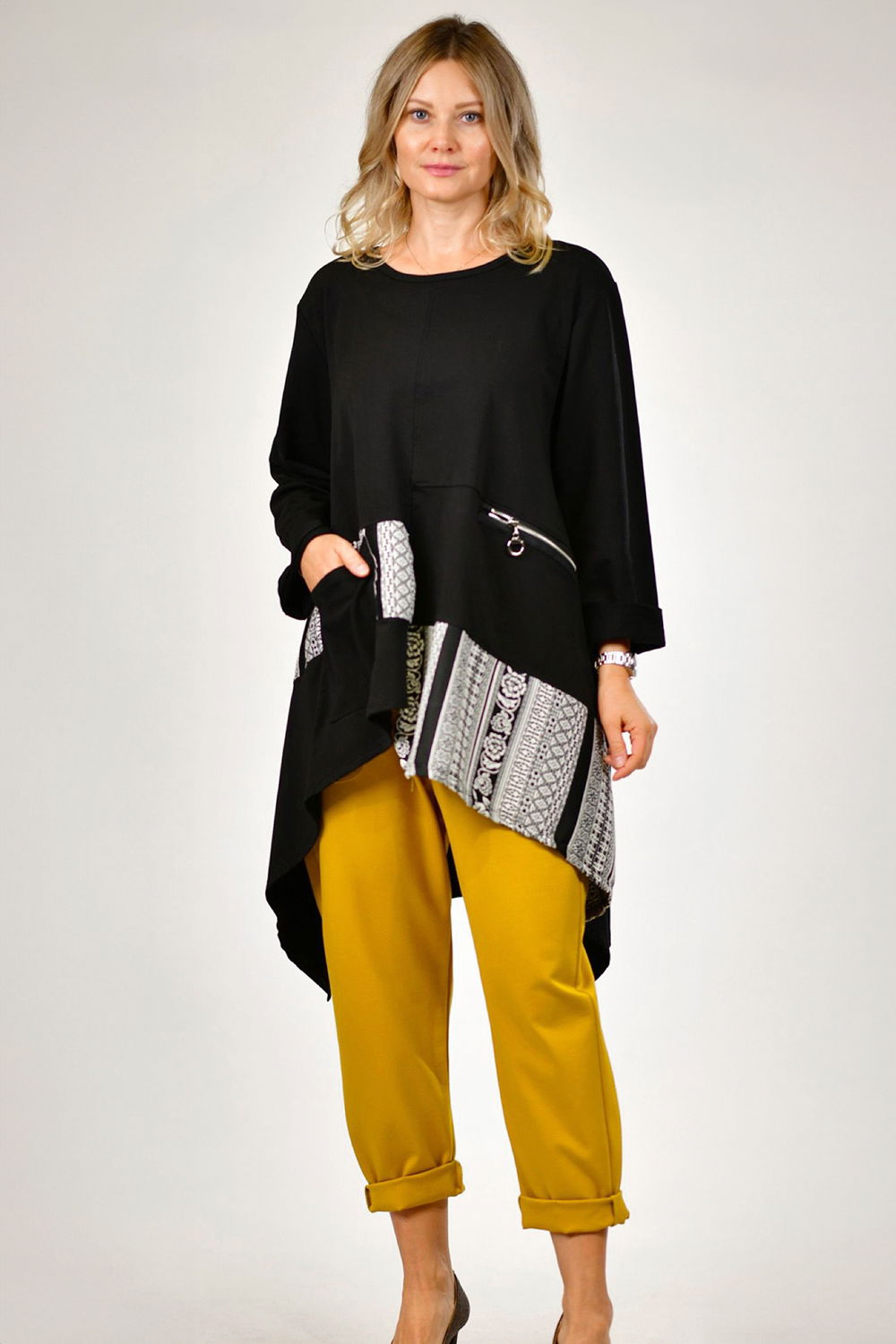 O tunica cu impact vizual, construita pe contrastul dintre negru intens si pattern-uri grafice cu textura fina. Croiul asimetric alungeste linia corpului si creeaza miscare scenica la pas, iar insertiile geometrice introduc ritm si rafinament contemporan.