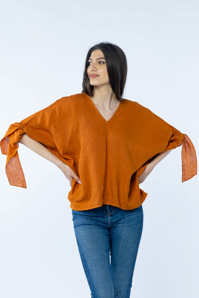 Shopika Bluza de vara cu funde, din in, oversize, caramizie