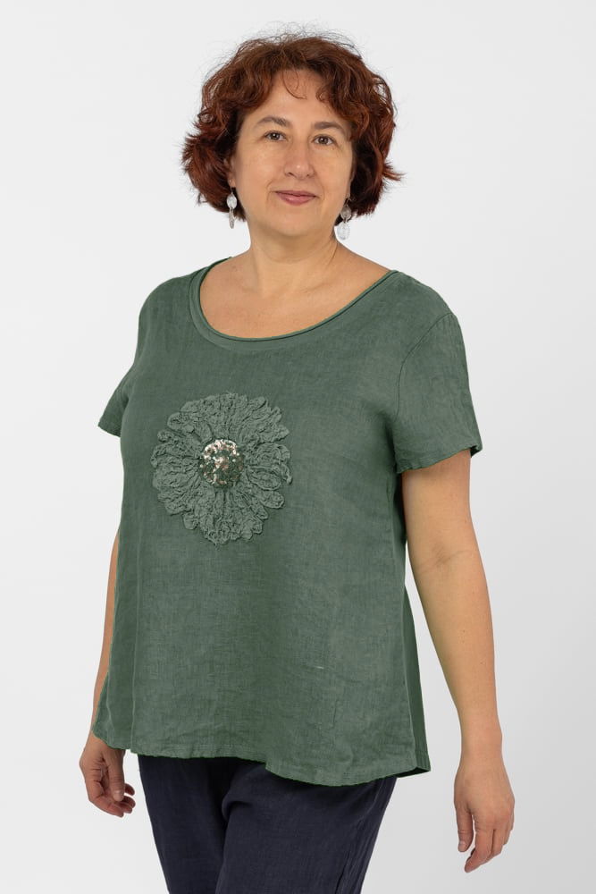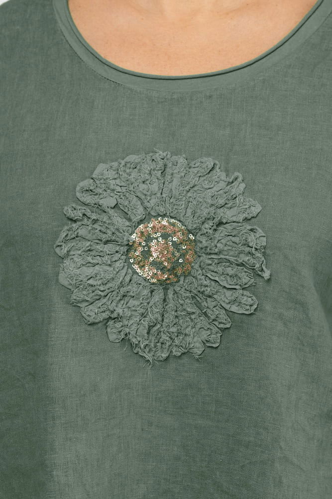 Shopika Bluza din in kaki, cu floare si paiete pe piept
