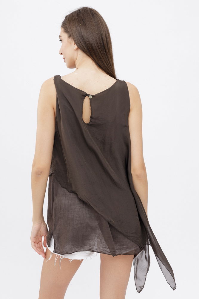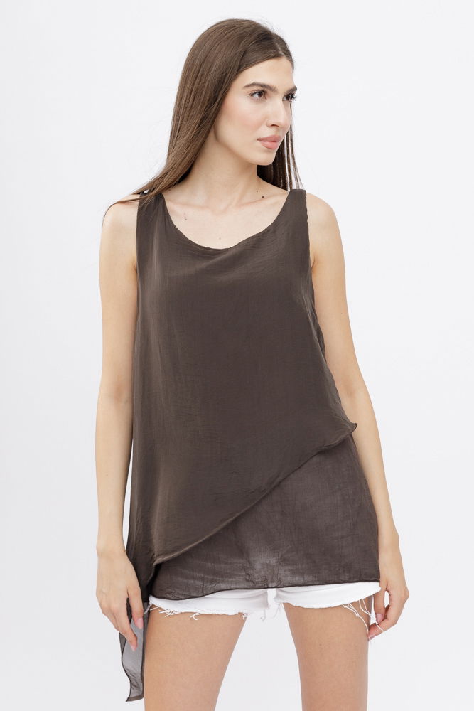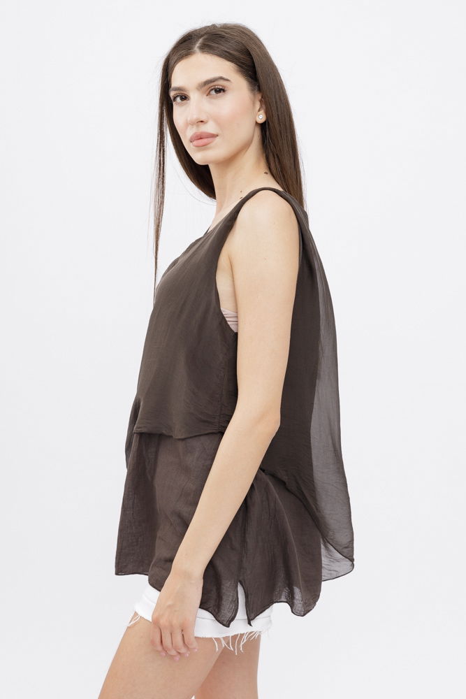 Shopika Bluza asimetrica in colturi din matase si vascoza si bumbac fara maneci, maro