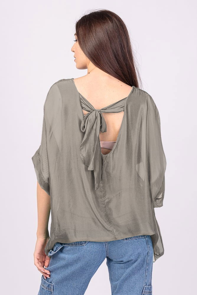 Shopika Bluza din matase si vascoza bej inchis, cu funda pe spate