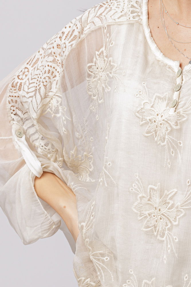 • Are maneci fluture cu insertie de dantela de 10 cm, pe lungimea manecii si posibilitate de scurtare a manecii cu nasture
