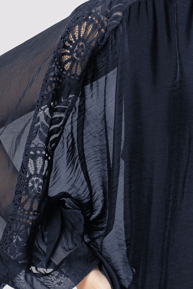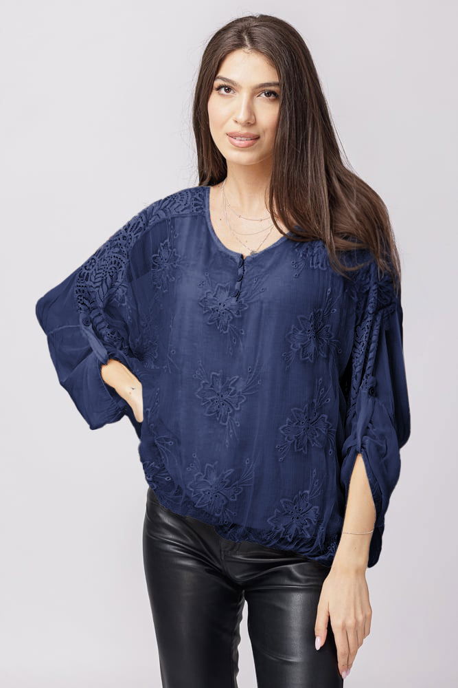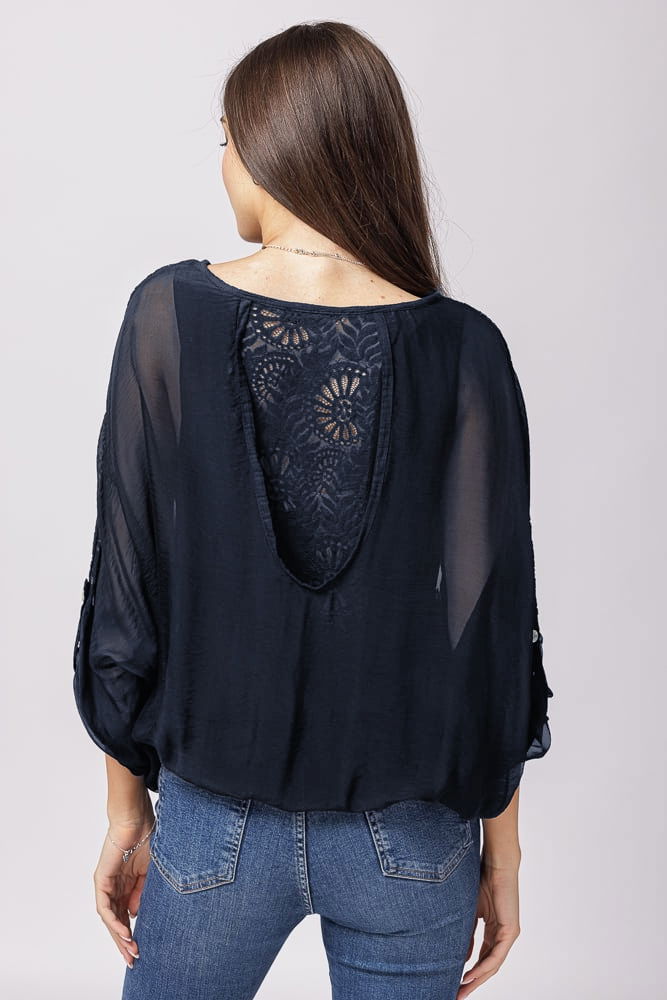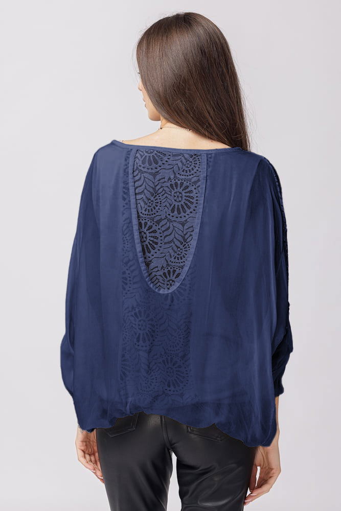 Shopika Bluza din matase si vascoza bleumarin brodata si dantela pe spate