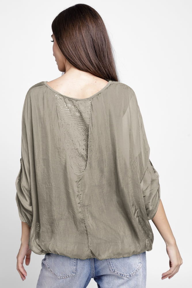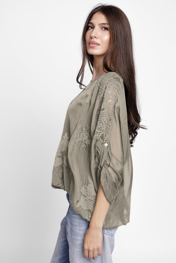 Shopika Bluza din matase si vascoza brodata, cu dantela pe spate, bej inchis