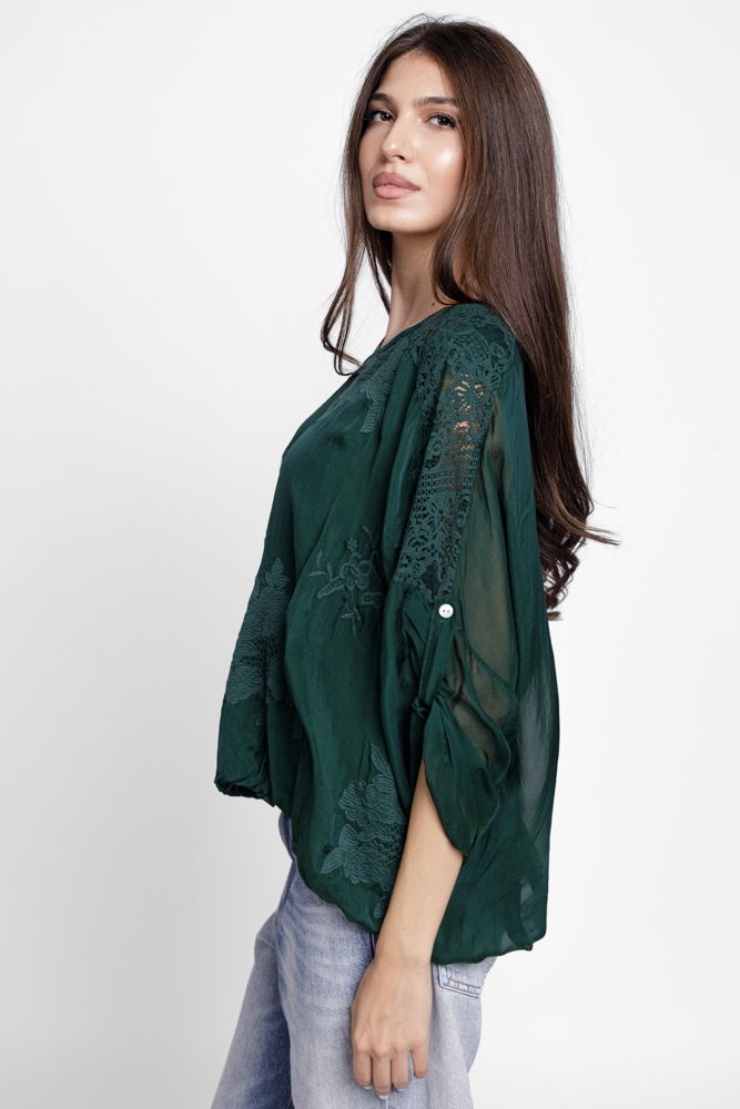Shopika Bluza din matase si vascoza brodata, cu dantela pe spate, verde inchis