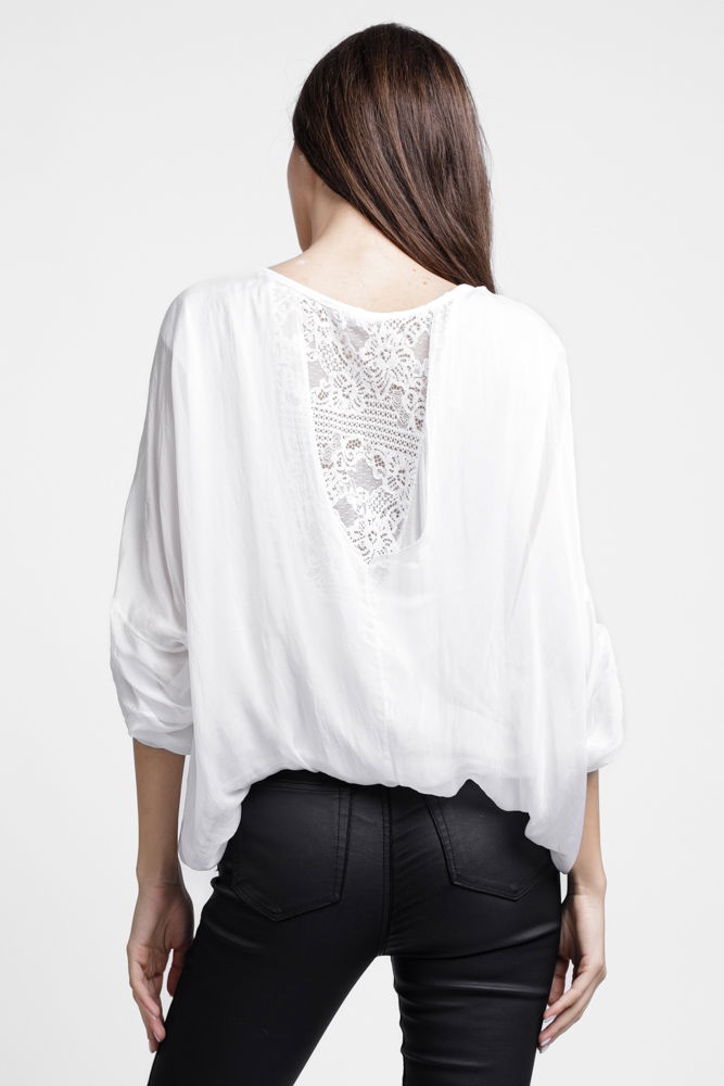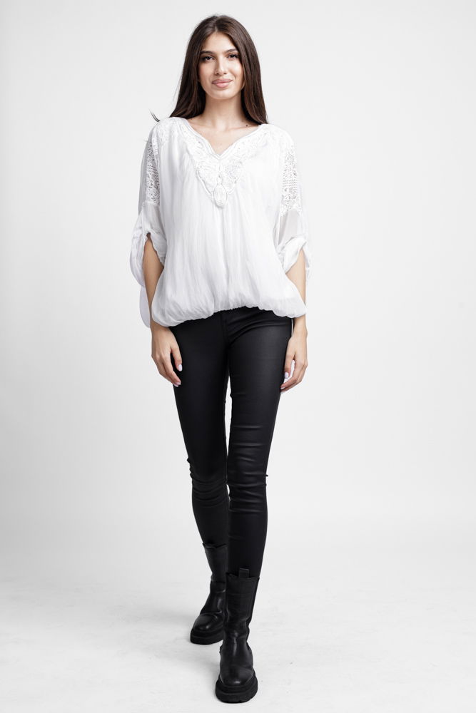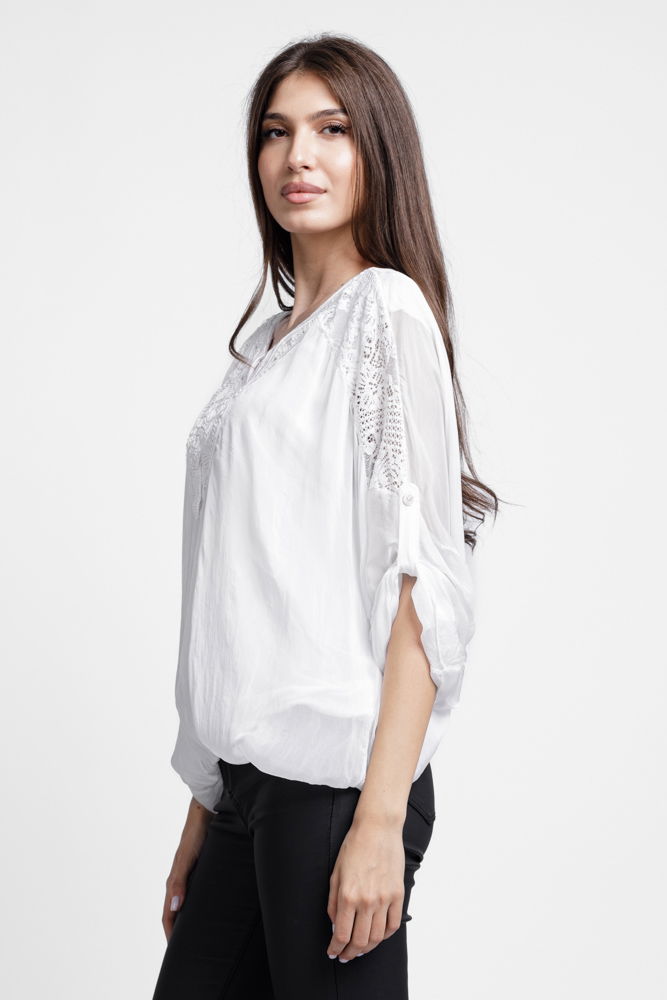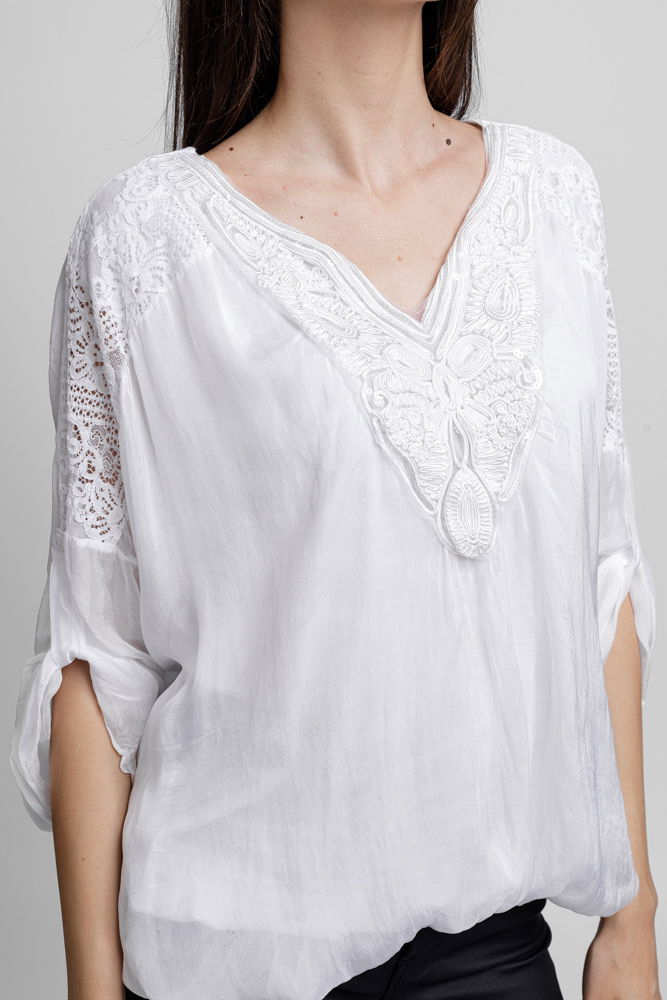 Shopika Bluza din matase si vascoza platca brodata, cu paiete fine si cu dantela pe spate, alba