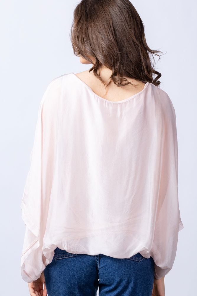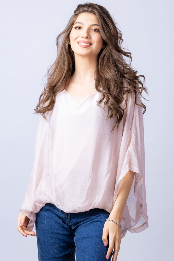Shopika Bluza roz diafan din matase si vascoza cu maneca fluture