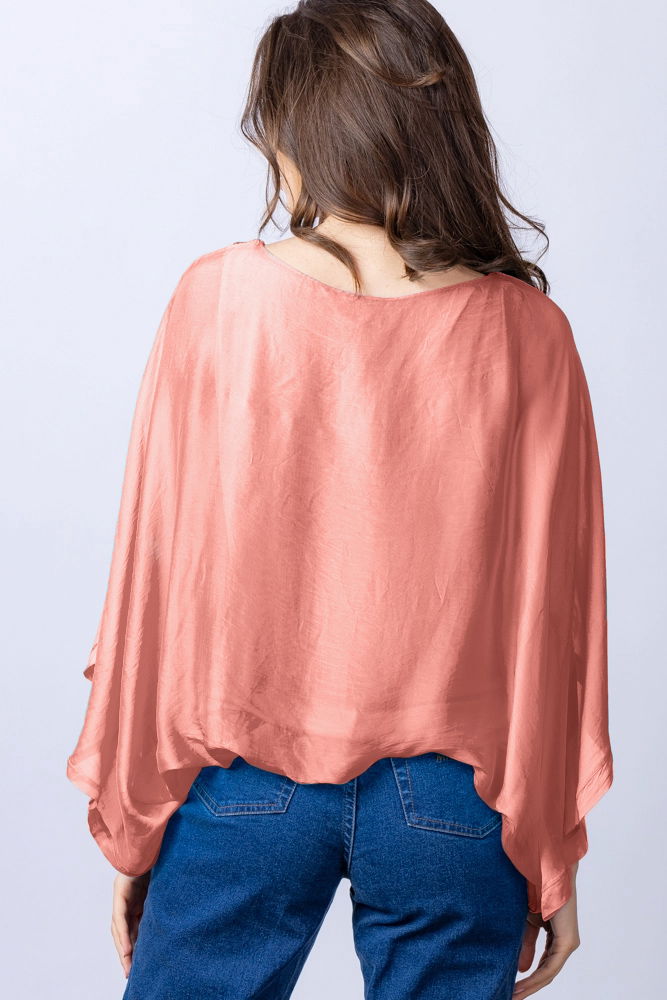 Shopika Bluza roz somon din matase si vascoza cu maneca fluture