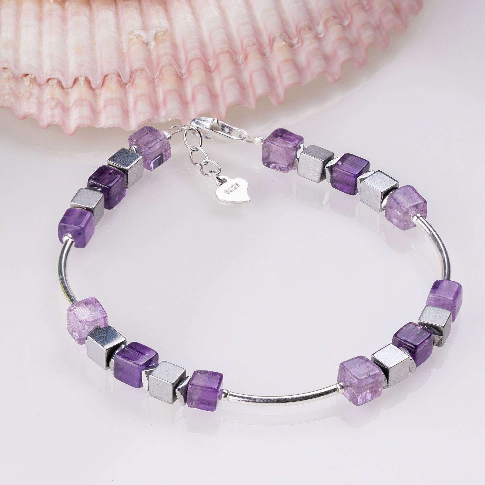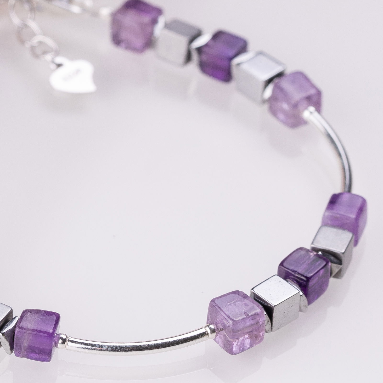 Bratara handmade cu tuburi curbe din argint, cuburi de ametist si ametrin (4 mm) si cuburi de hematit argintiu mat si lucios (4mm). Incuietoare si lant prelungitor din argint cu terminatie in forma de inimioara.