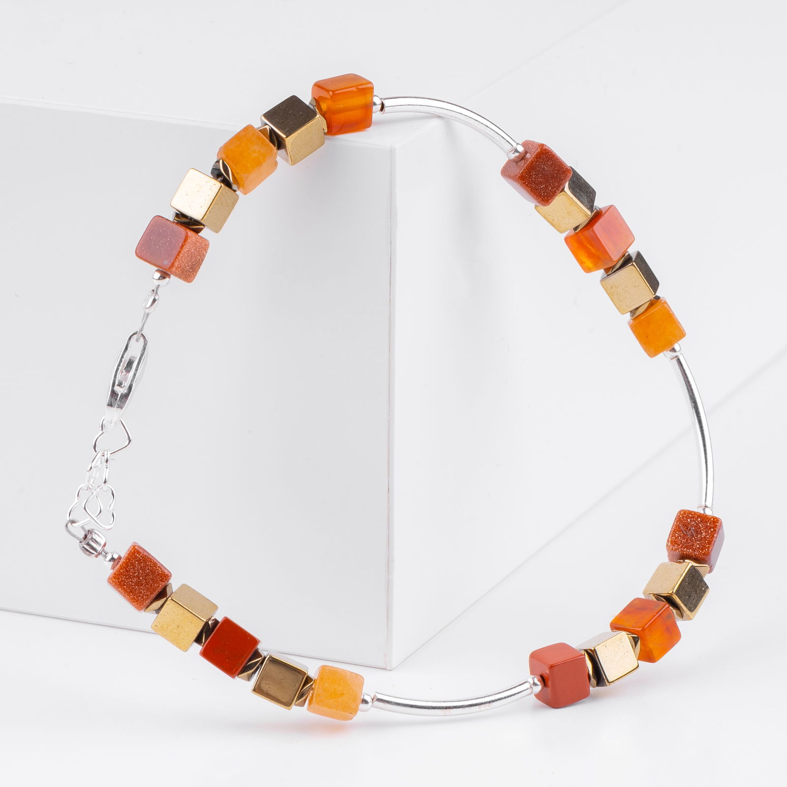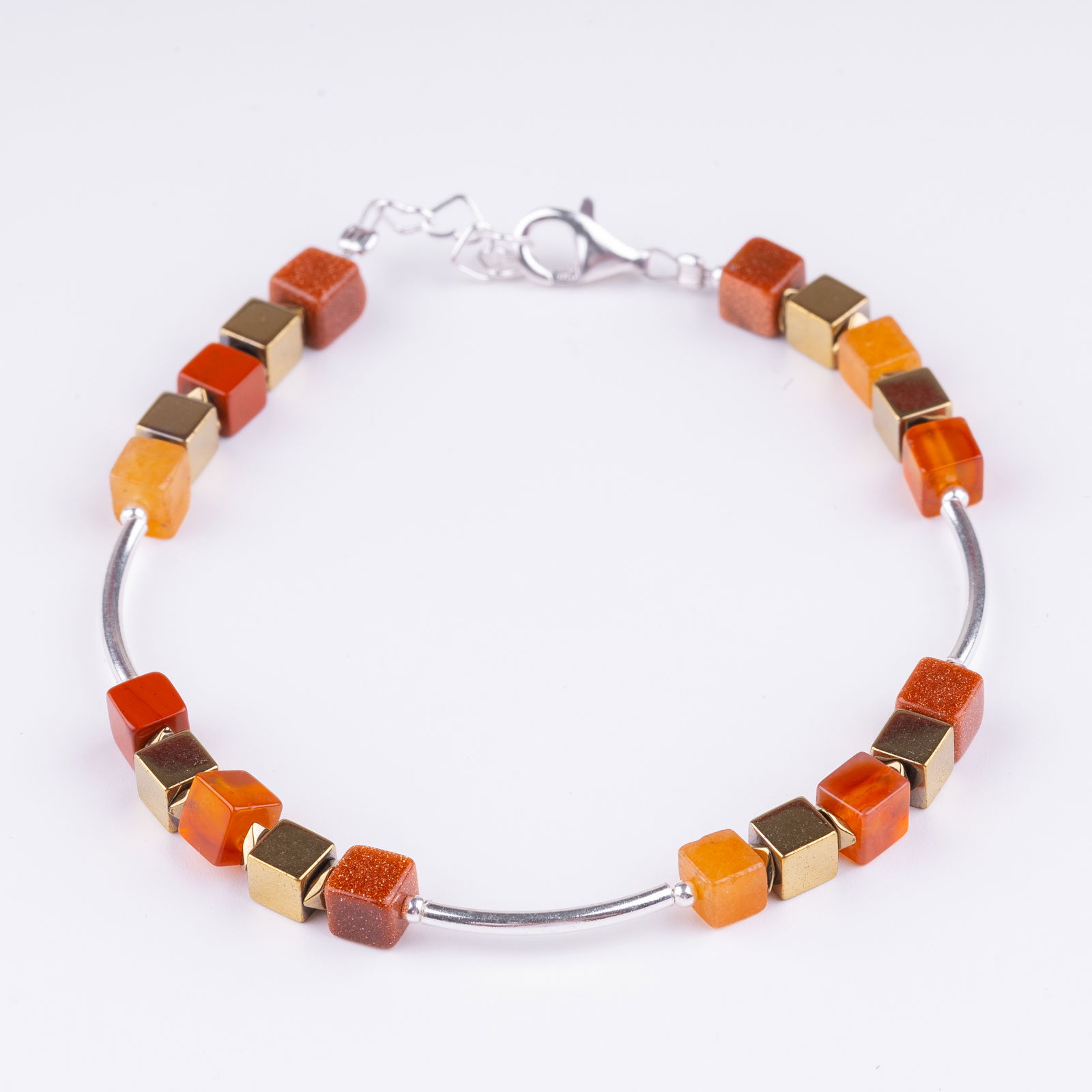 • Bratara handmade cu tuburi curbe din argint, cuburi de carneol (4 mm) si cuburi de hematit auriu mat si lucios (4mm).