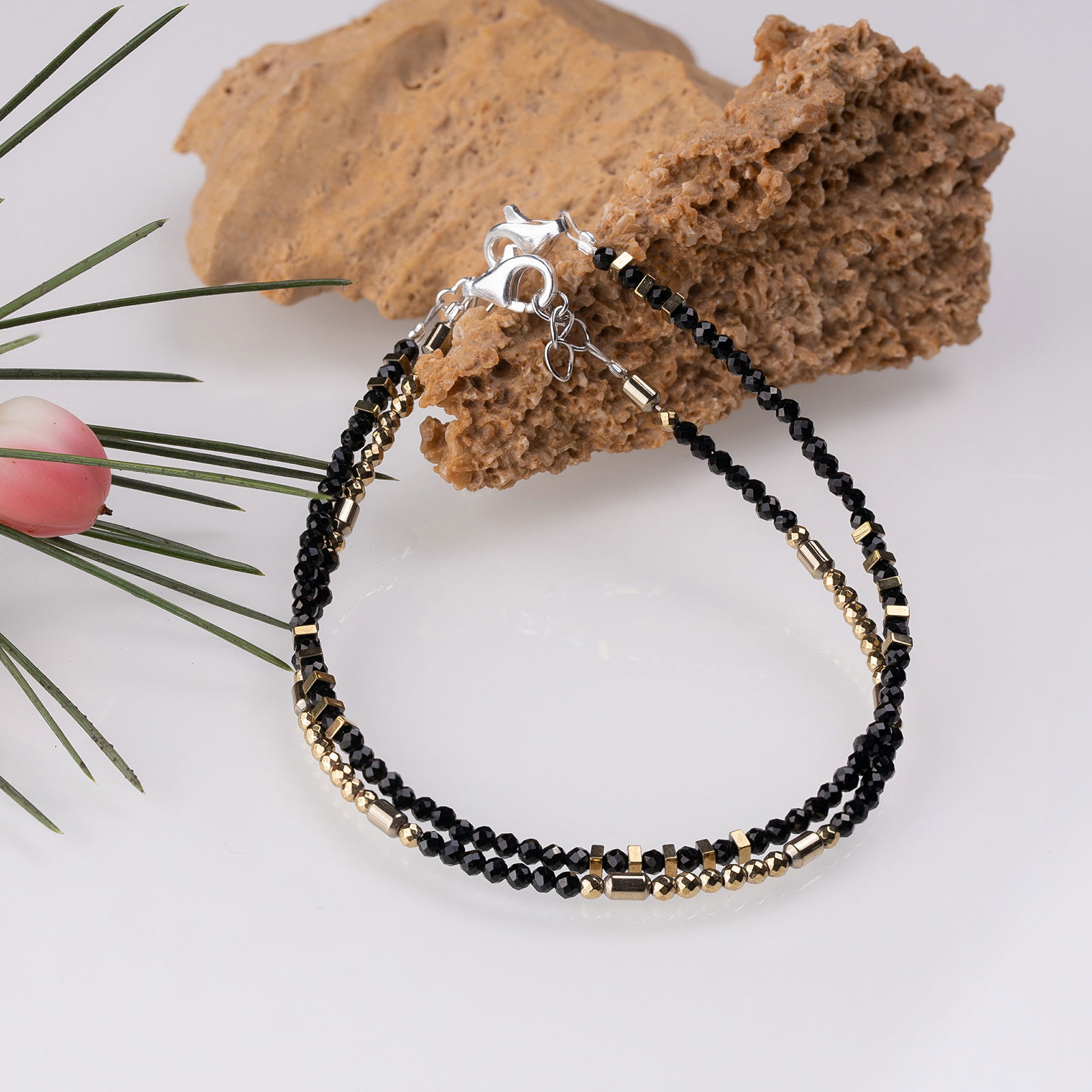 • Bratara handmade cu pietre fatetate din cubic zirconia negru de 1,5 mm cu hematit auriu fatetat de 1.5 mm.