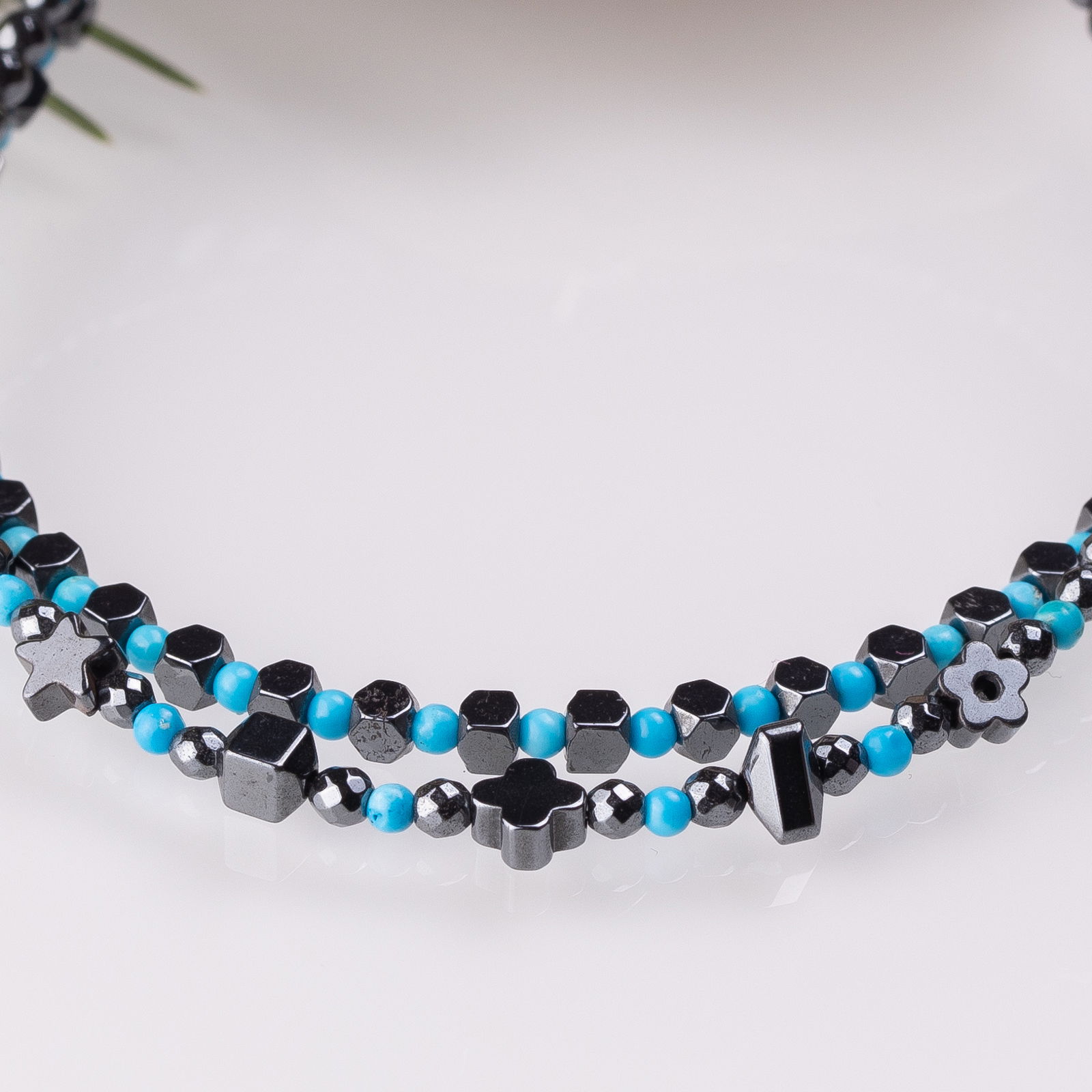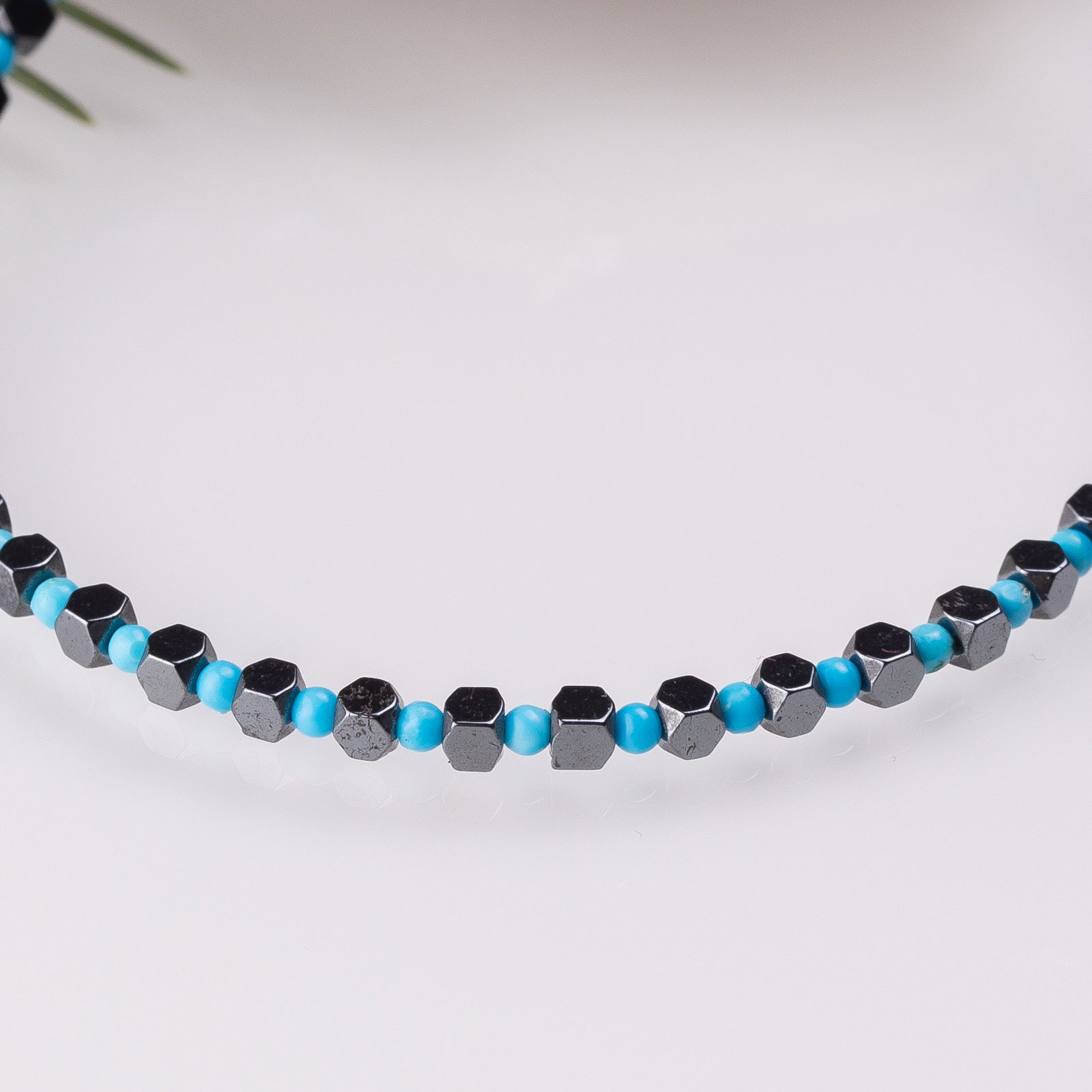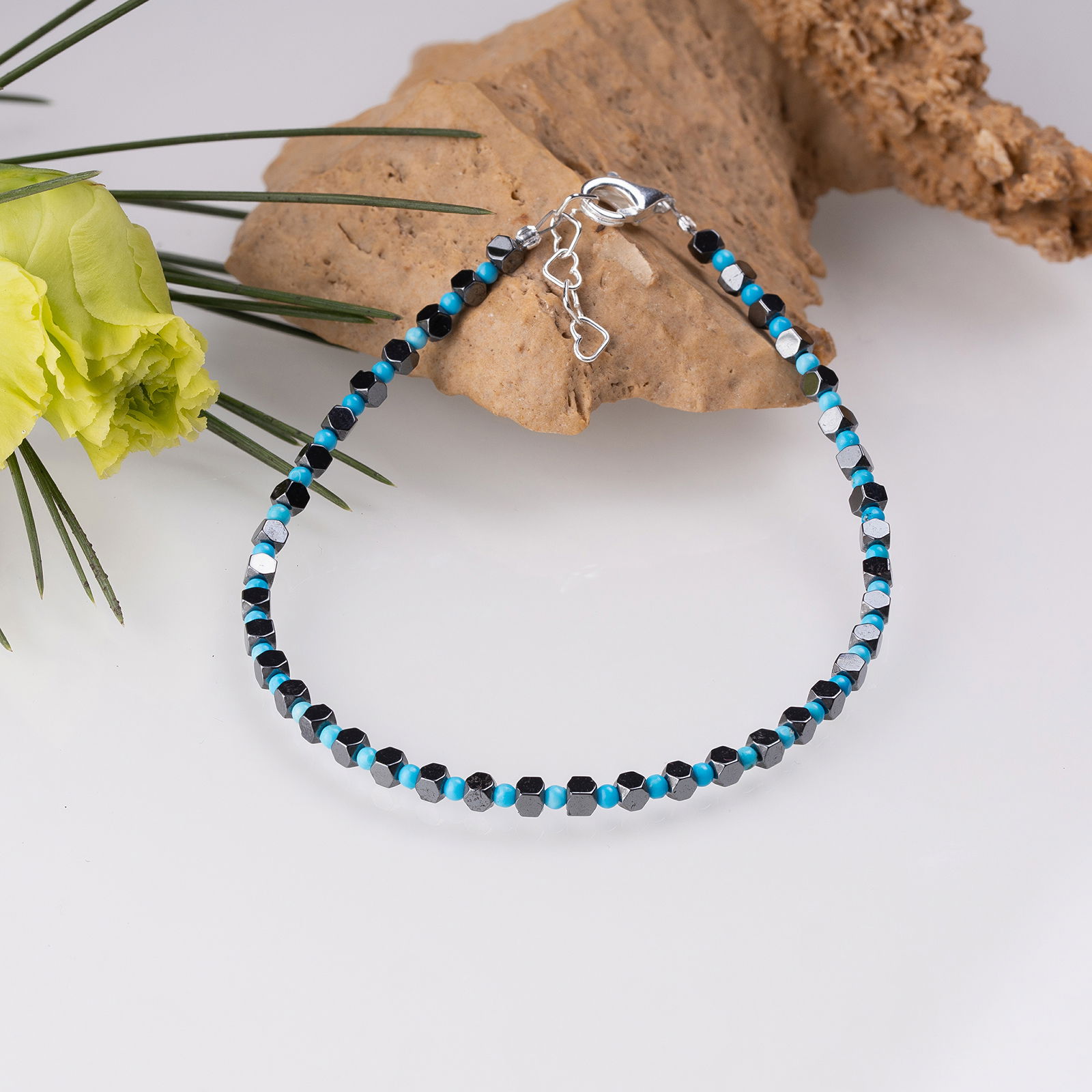 Bratara handmade cu pietre cub din hematit argintiu inchis lucios de 2 mm si turcoaz de 1.5 mm.